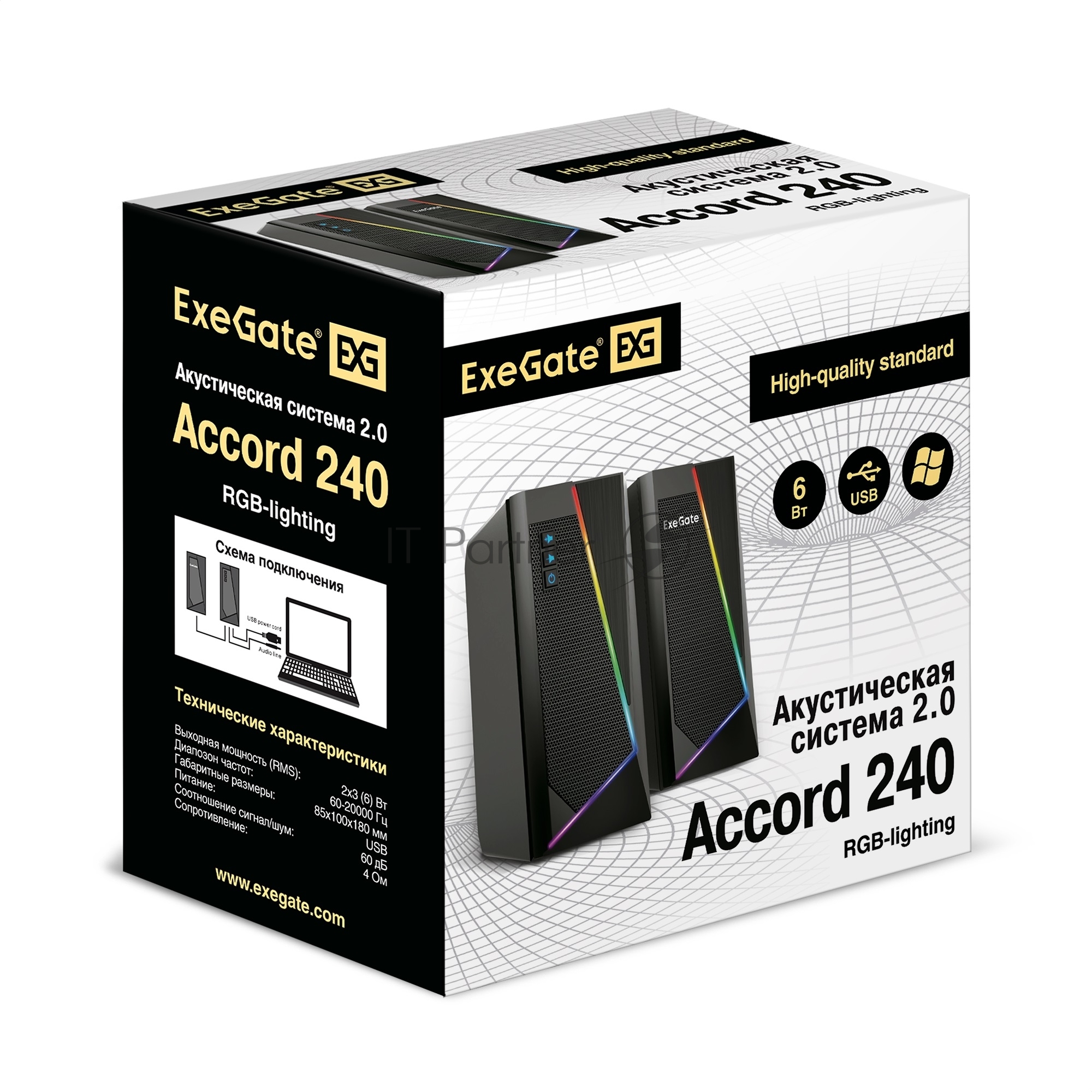 Акустическая система 2.0 ExeGate EX289688RUS Accord 240 (питание USB, 2х3Вт (6Вт RMS), 60-20000Гц, цвет черный, RGB подсветка)