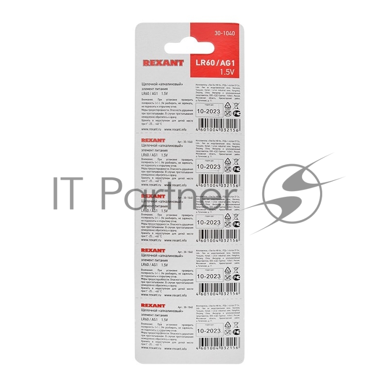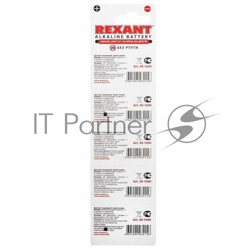 Батарейка LR60, AG1, LR621, G1, 164, GP64A, 364, SR621W REXANT