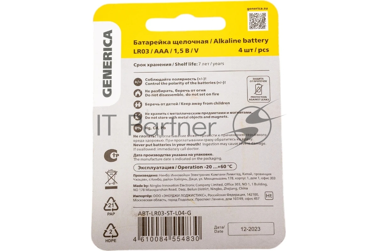 Батарейка щелочная Alkaline LR03/AAA (4шт/блистер) GENERICA