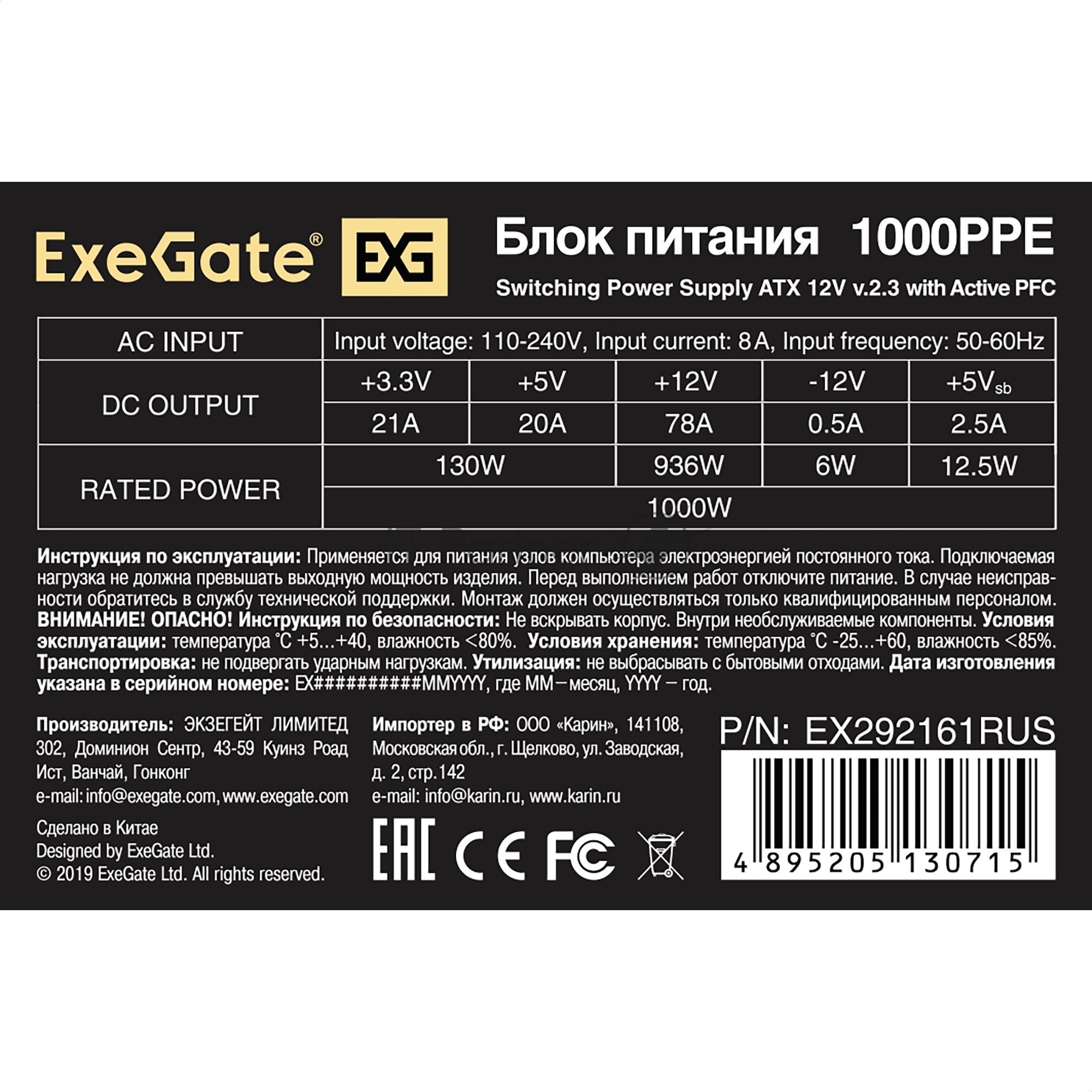 Блок питания ExeGate 1000PPE, 1000Вт, 120мм, черный