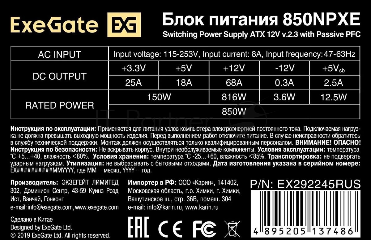 Блок питания ExeGate 850NPXE, 850W, (ATX, PPFC, SC, 12cm fan, 24pin, 2x(4+4)pin, 2xPCI-E, 5xSATA, 3xIDE, black, кабель 220V 1,8м с защитой от выдергивания)