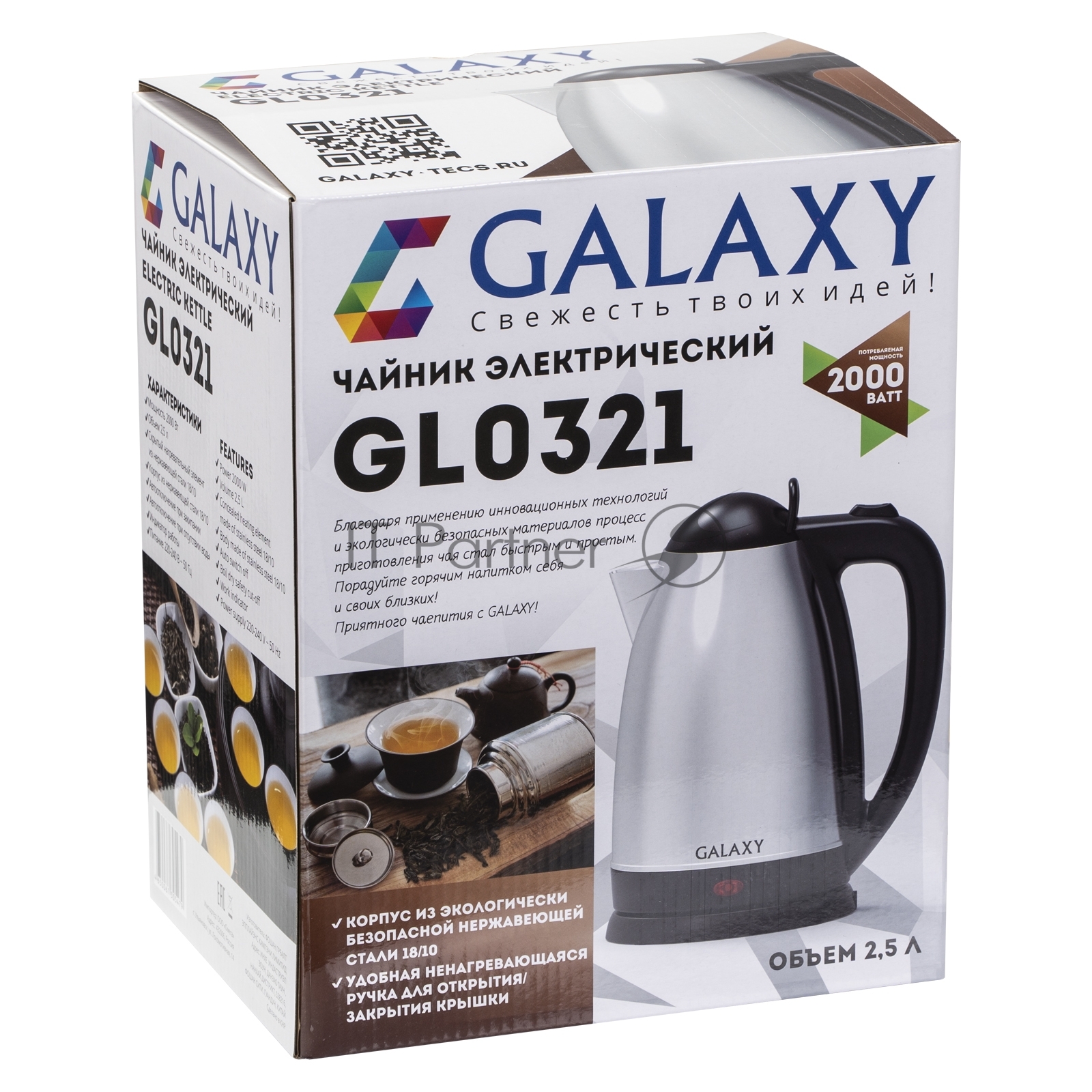 Чайник электрический Galaxy GL 0321, серый, металл, 2000 Вт, 2,5 л, корпус из нержавеющей стали AISI 304, скрытый нагревательный элемент из нержавеющей стали AISI 304, индикатор работы