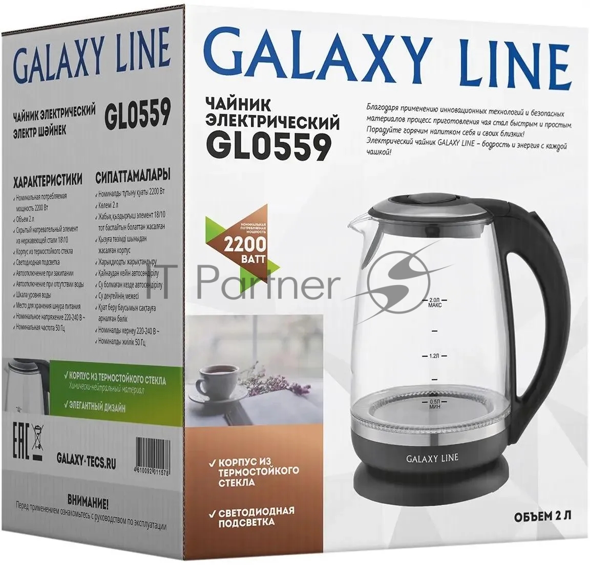 Чайник электрический Galaxy Line GL 0559, черный, стекло, 2200 Вт, 2 л