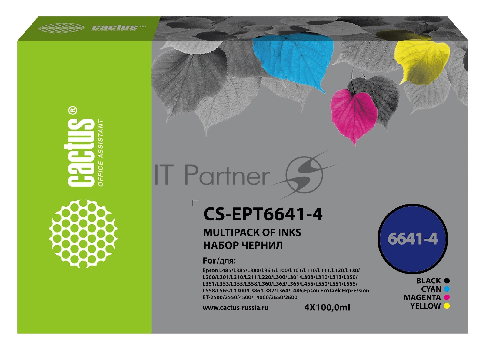 Чернила Cactus CS-EPT6641-4 голубой/пурпурный/желтый/черный набор 4×100мл для Epson L100/L110/L120/L132/L200/L210/L222/L300/L312/L350/L355/L362/L366/L456/L550/L555/L566/L1300