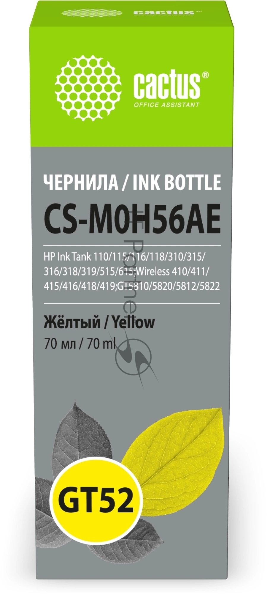 Чернила Cactus CS-M0H56AE GT52 желтый 70мл для HP Ink Tank 110/115/116/118/310/315/316/318/319/515/615;Wireless 410/411/415/416/418/419;GT5810/5820/5812/5822