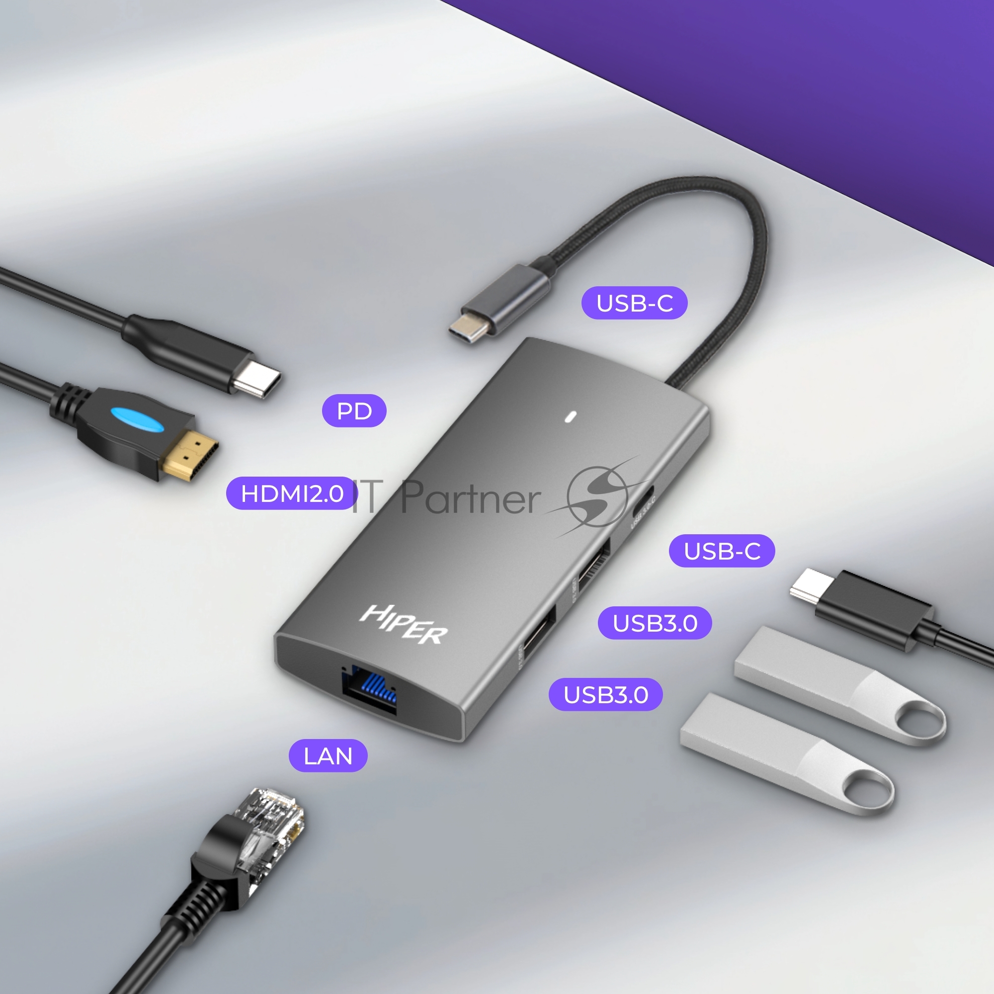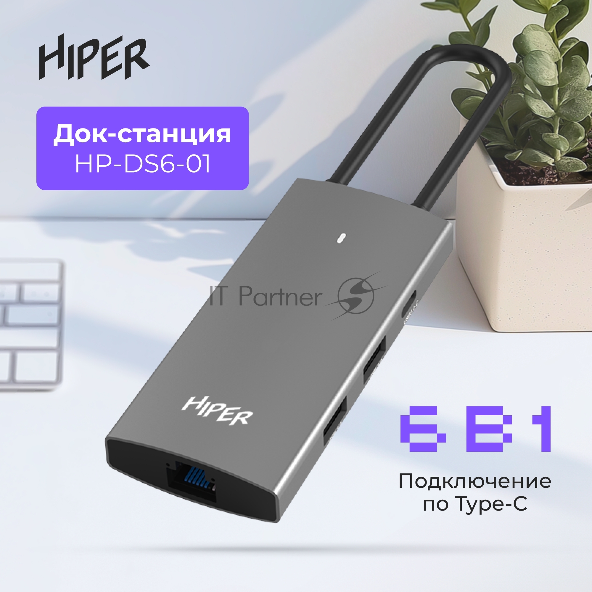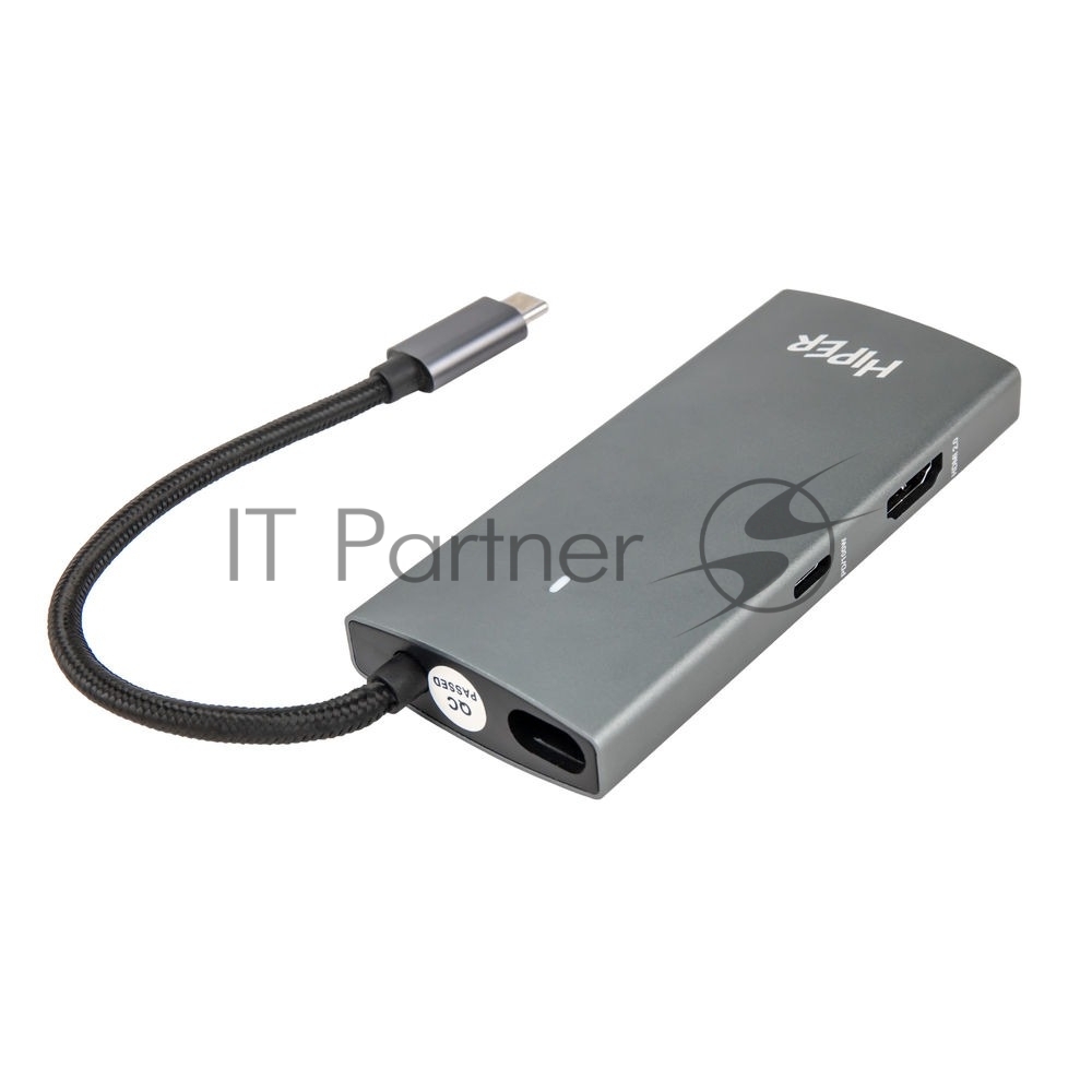 Док-станция HIPER Docking station USB-C HUB 6in1 (1*USB-C 100W PD, 1*HDMI 4K@60Hz, 2*USB-A 3.0 (5Gbps data), 1*USB-C 3.0 (5Gbps data), 1*RJ45 Gb)