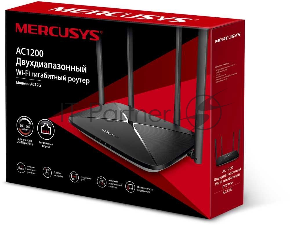 Двухдиапазонный Wi-Fi роутер Mercusys AC12G AC1200,до 867 Мбит/с на 5 ГГц + до 300 Мбит/с на 2,4 ГГц, 802.11ac/a/b/g/n