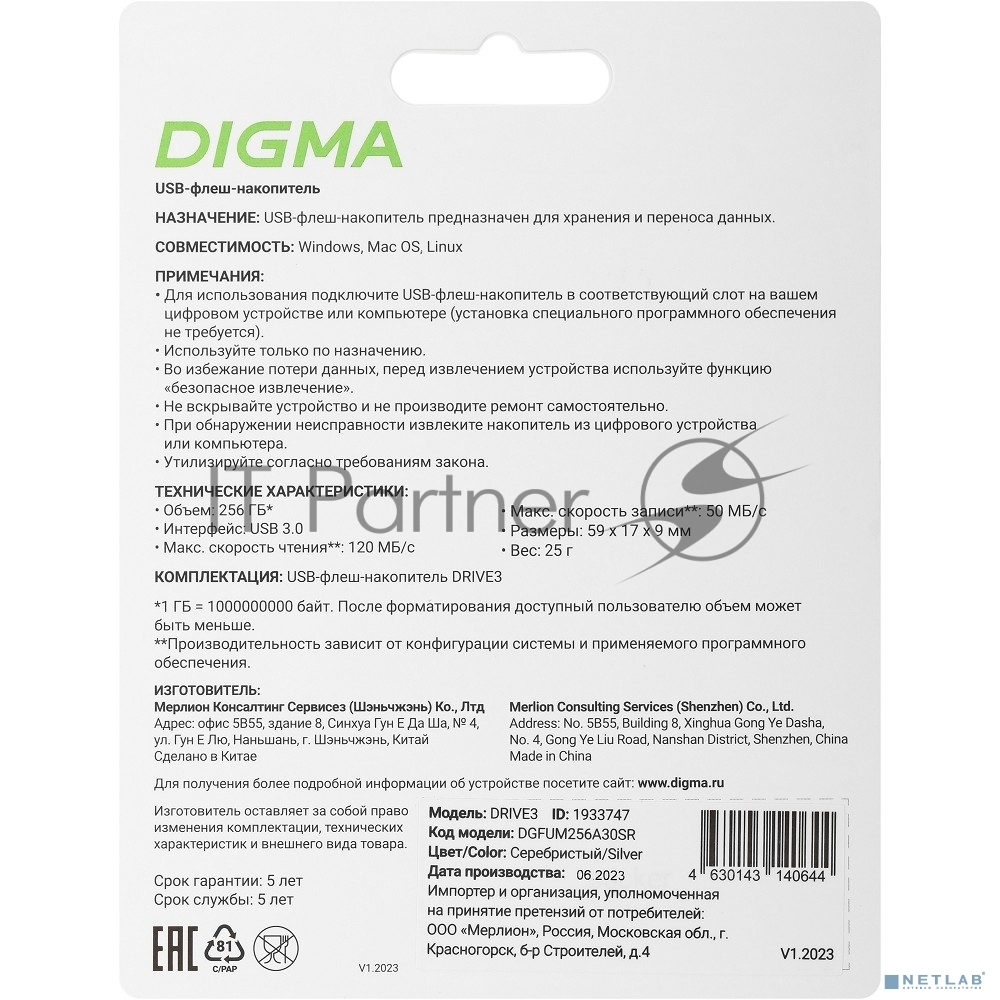 Флеш Диск Digma 256Gb DRIVE3 DGFUM256A30SR USB3.0 серебристый