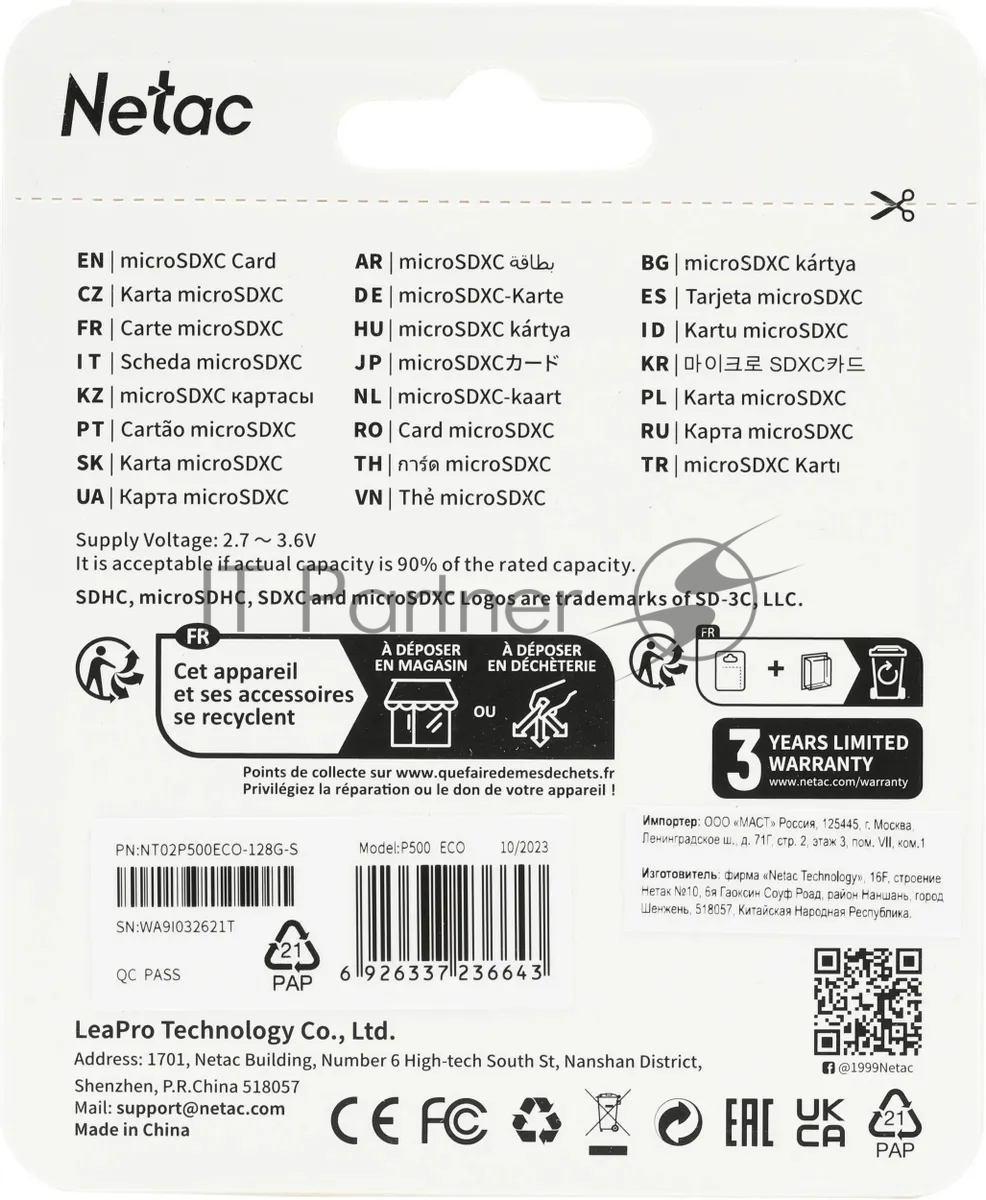 Флеш карта microSDHC 128GB Netac P500 ECO (NT02P500ECO-128G-S) (без SD адаптера)