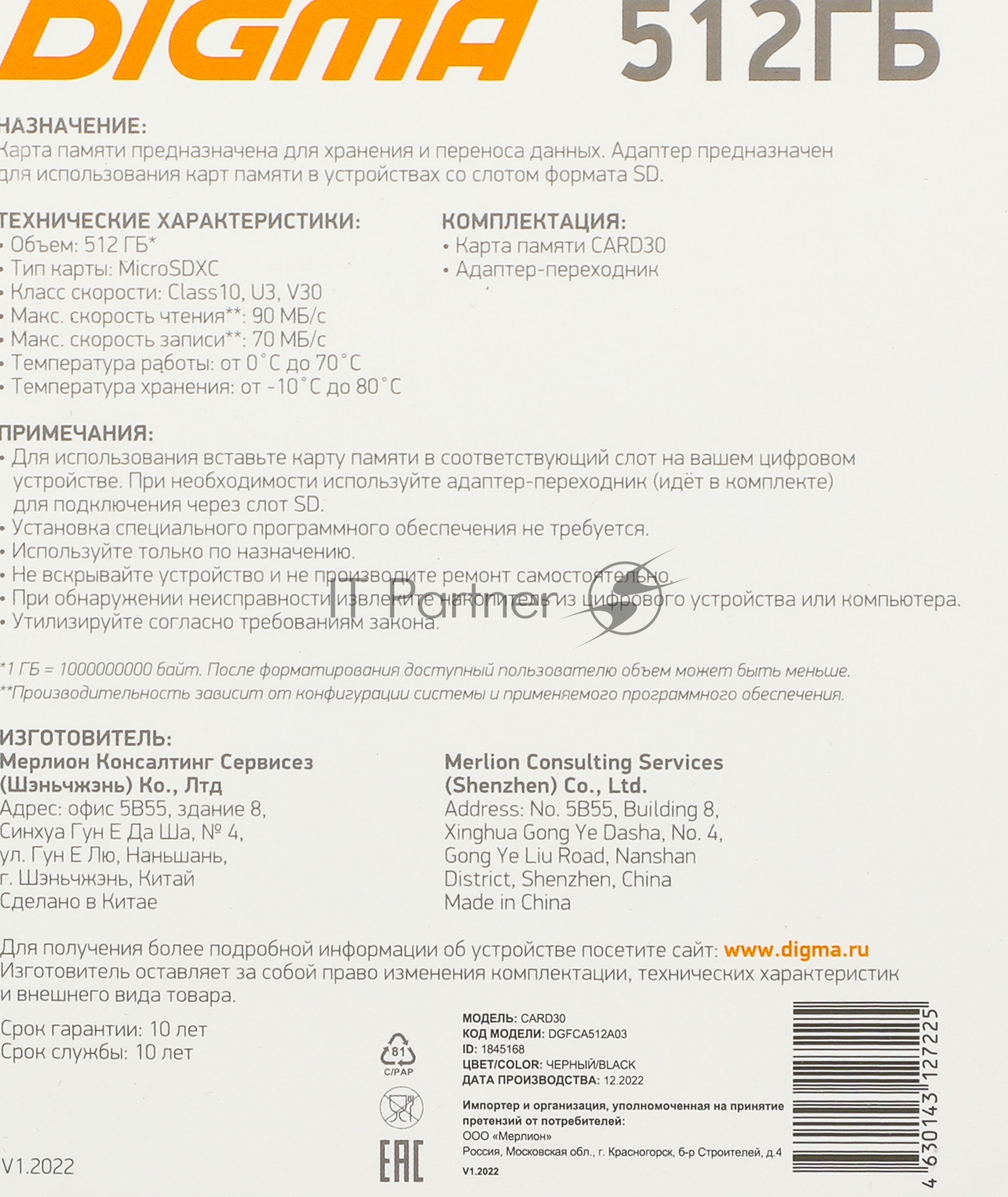 Флеш карта microSDXC 512Gb Class10 Digma CARD30 + adapter