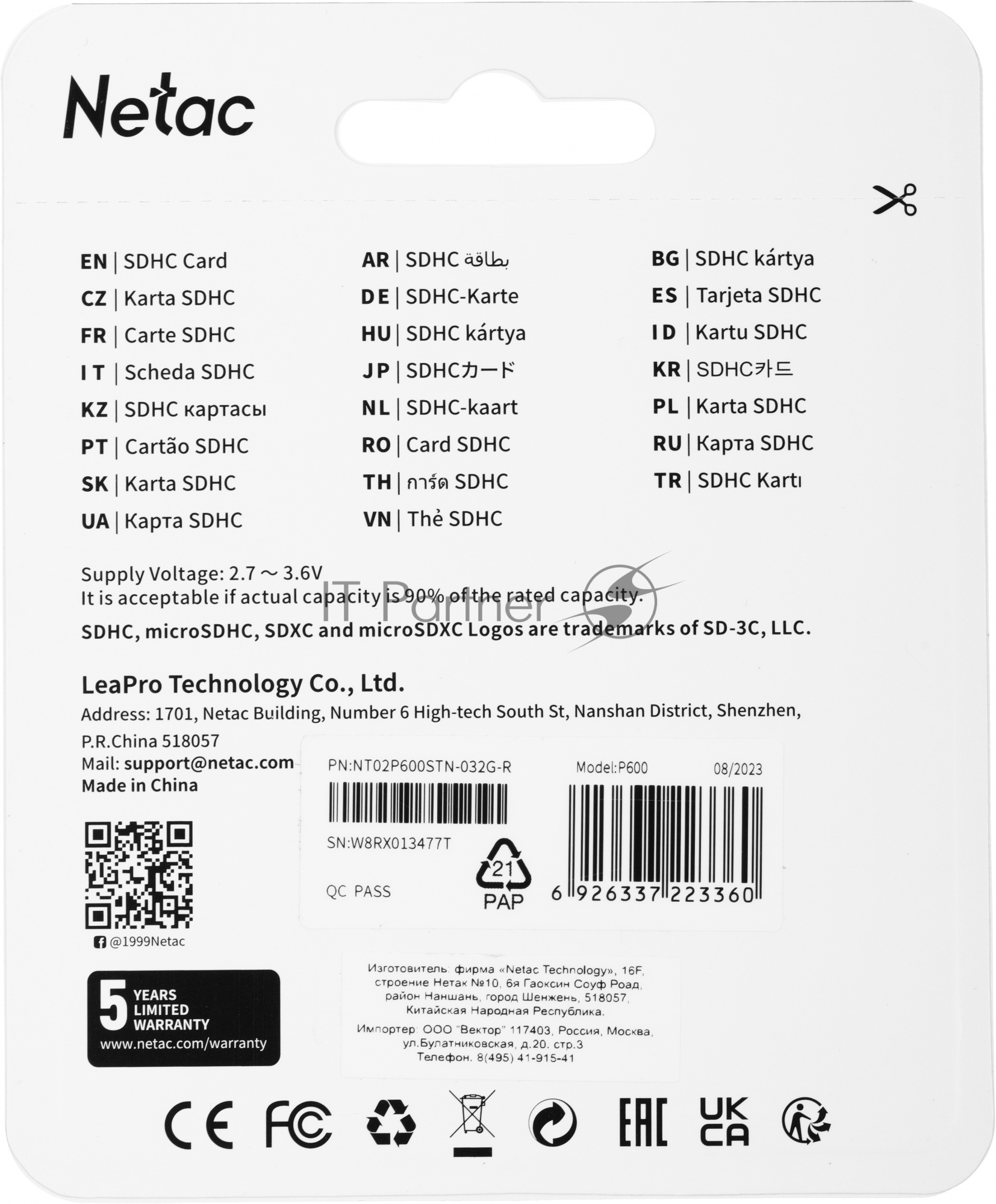 Флеш карта SDHC 32GB Netac Class 10 UHS-I U1 P600 [NT02P600STN-032G-R]