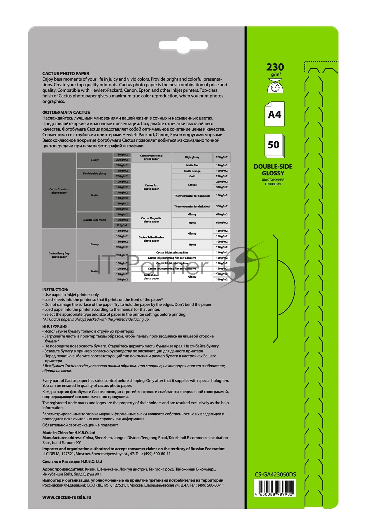 Фотобумага Cactus CS-GA423050DS A4/230г/м2/50л./белый глянцевое/глянцевое для струйной печати