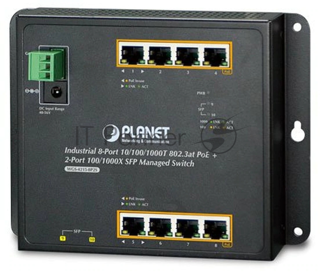 Индустриальный коммутатор WGS-4215-8P2S IP30, IPv6/IPv4, 8-Port 1000T 802.3at PoE + 2-Port 100/1000X SFP Wall-mount Managed Ethernet Switch (-40 to 75 C, dual power input on 48-56VDC terminal block and power jack, SNMPv3, 802.1Q VLAN, IGMP Snooping, SSL, SSH, ACL)