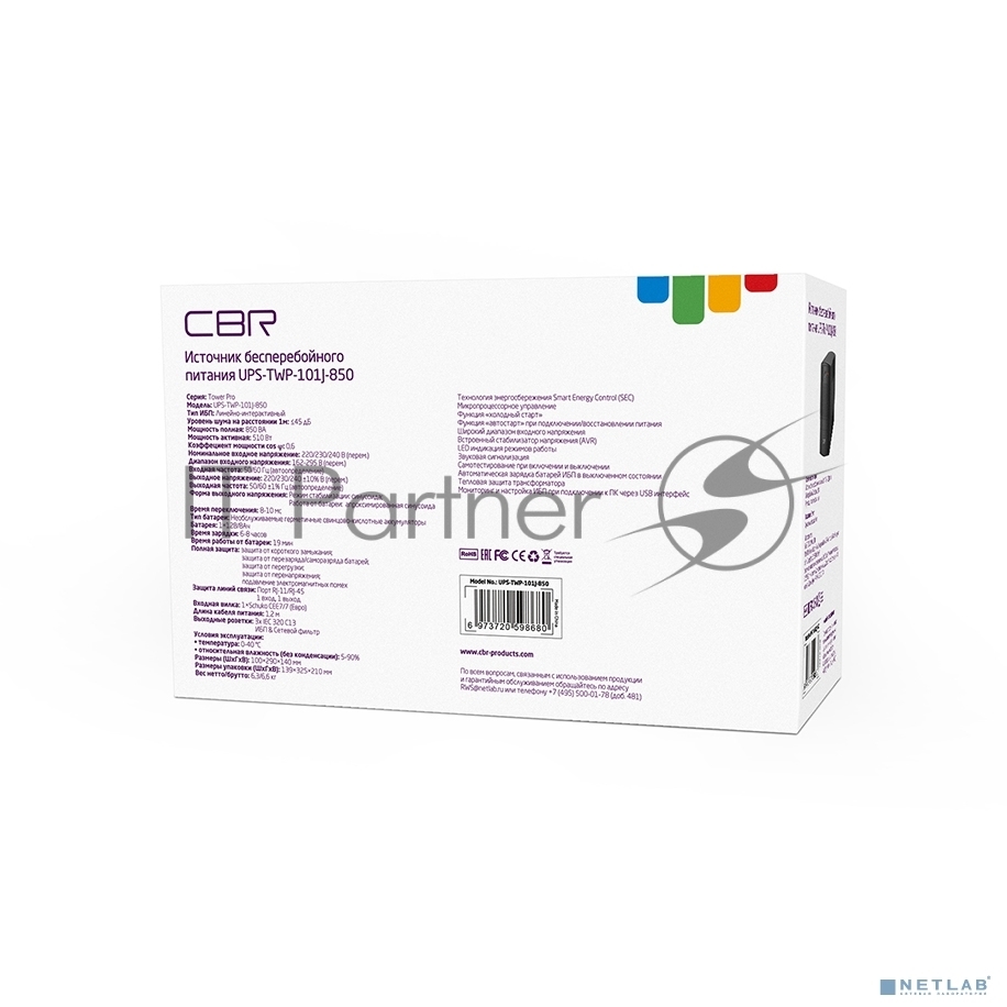 Источник бесперебойного питания CBR [UPS-TWP-101J-850] 850VA/510W, IEC 320 C13 x3 outlets, LED, USB Type-B, RJ11/45 AVR, SEC, 12V/8Ah