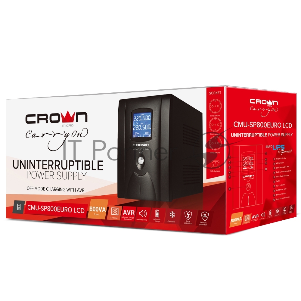 Источник бесперебойного питания CROWN 800VA/510W, металл, 1x12V/9AH, розетки 3*EURO+1*IEC bybass, трансформатор AVR 145-280V, LCD дисплей, съёмный кабель 1.2м, фильтр телефонной и ethernet линии RJ11/45, защита батареи, от перегрузки, от КЗ