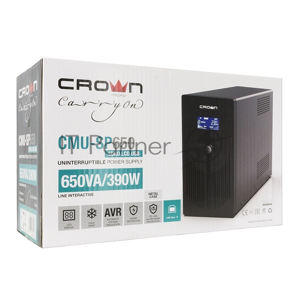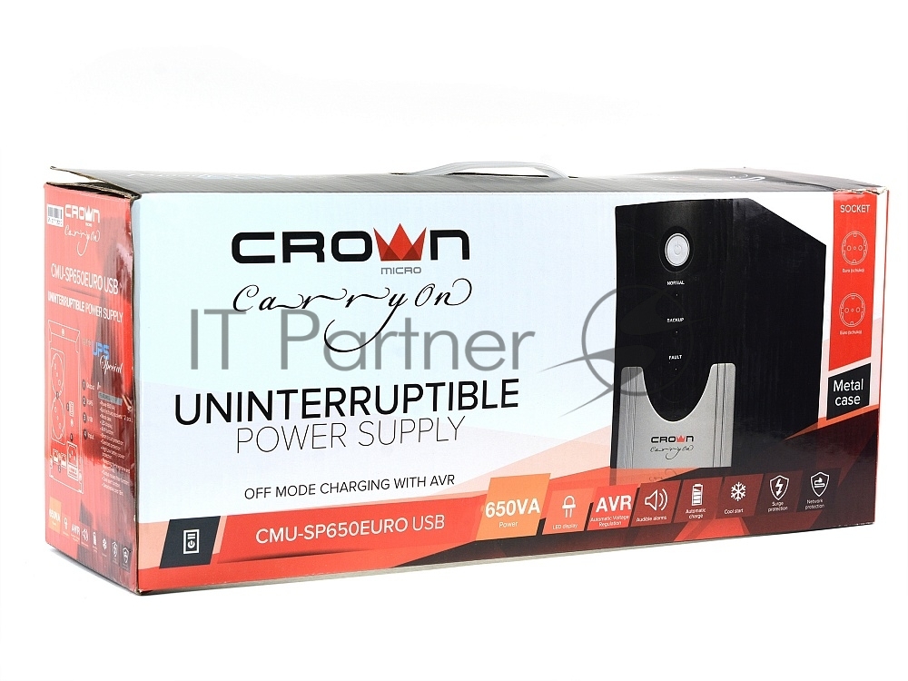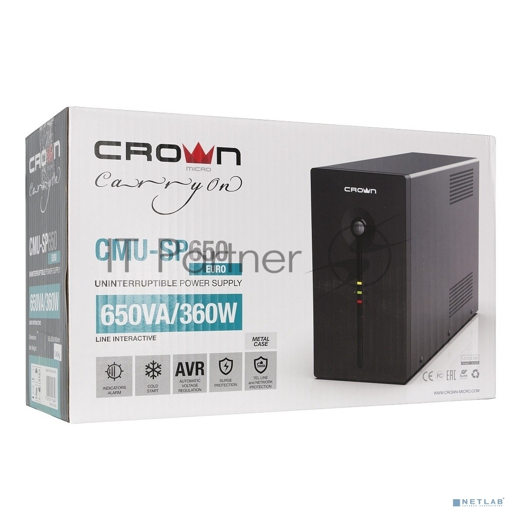 Источник бесперебойного питания CROWN Line Intractive CMU-SP650EURO USB 650VA390W, корпус металл, 1x12V/7AH, розетки 2*EURO+3*IEC, трансформатор AVR 140-290V, съёмный кабель 1.2 м, порт RJ11/45, порт USB, защита: от перегрузки, от КЗ, от скачков напражения