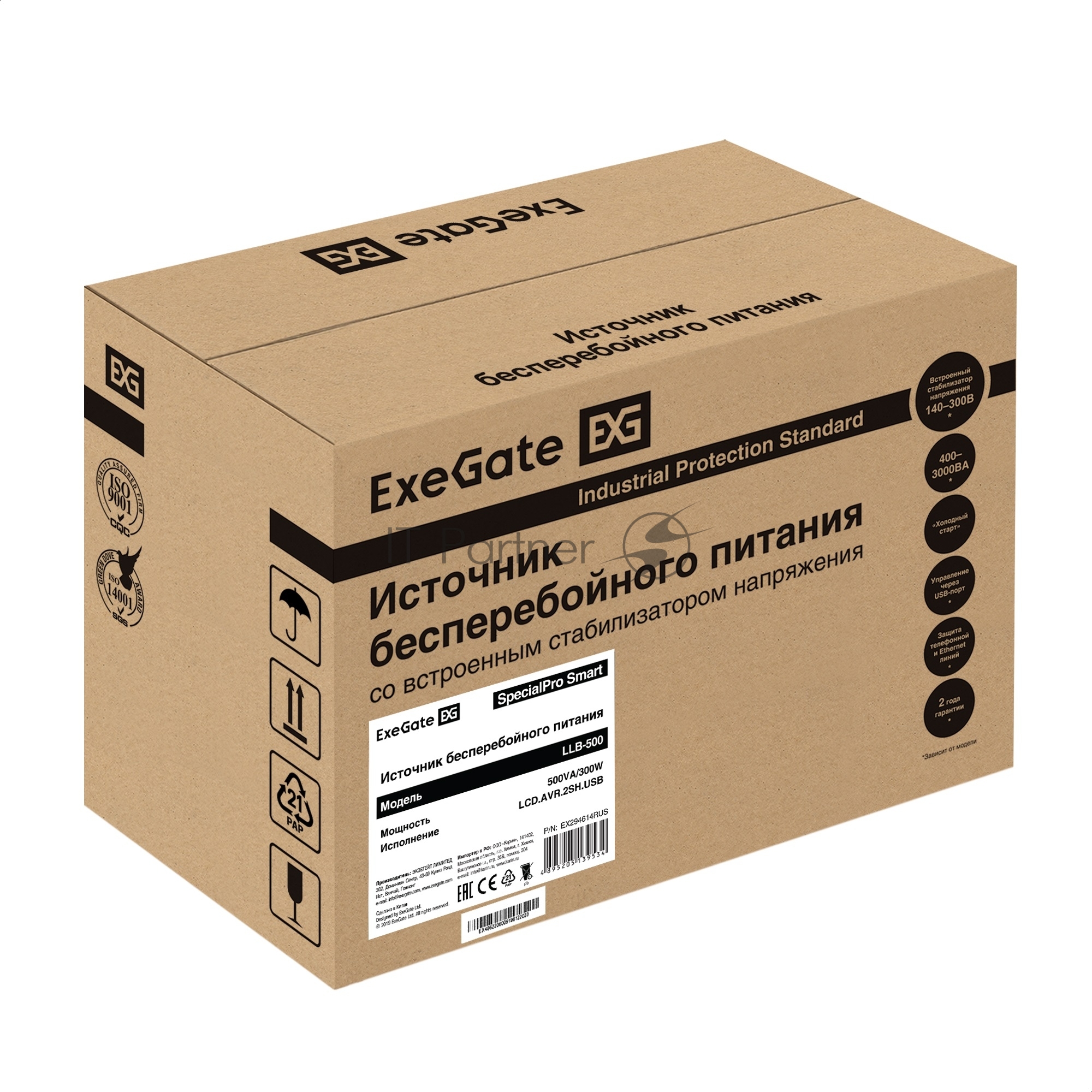 Источник бесперебойного питания ExeGate SpecialPro Smart LLB-500.LCD.AVR.2SH.USB (500VA/300W, LCD, AVR, 2*Schuko, USB, Black)