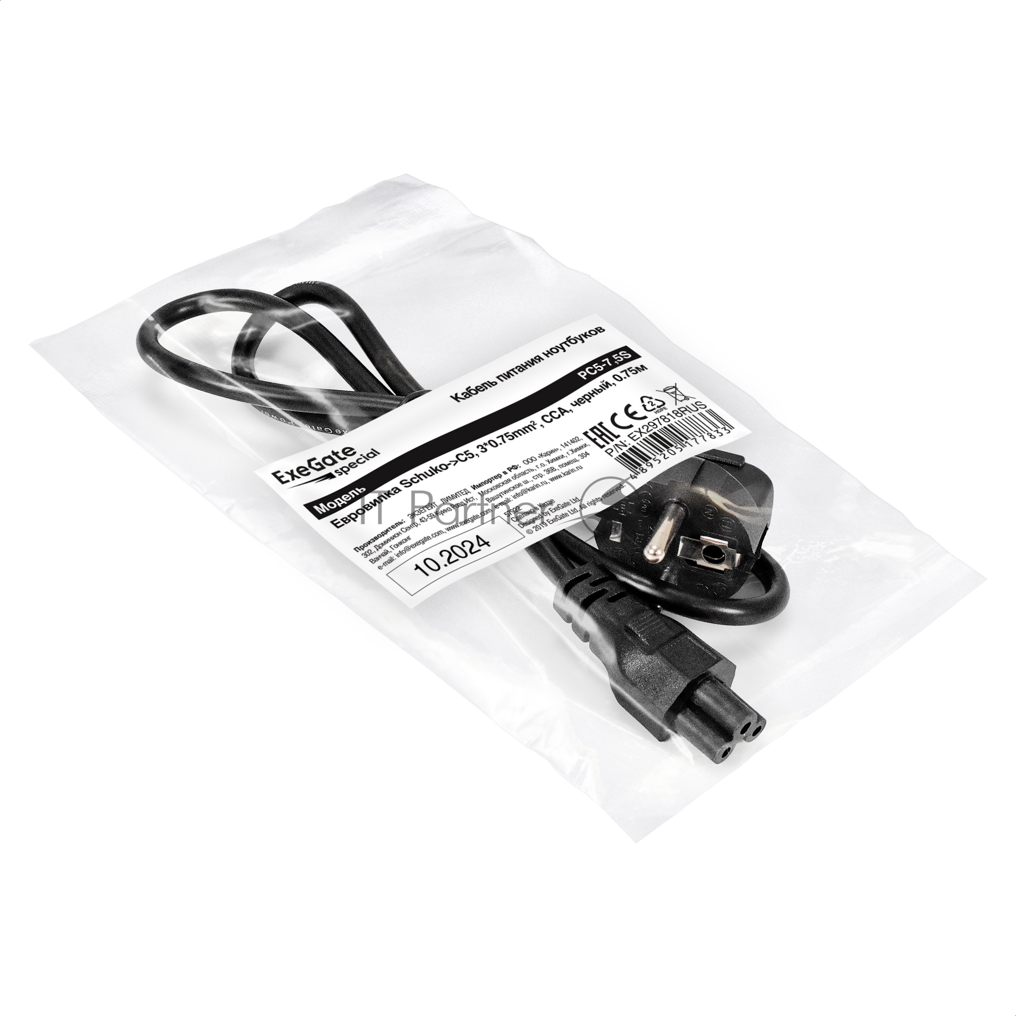 Кабель питания ноутбуков ExeGate Special PC5-7,5S (Евровилка Schuko-)C5, 3*0.75mm2, CCA, черный, 0.75м)