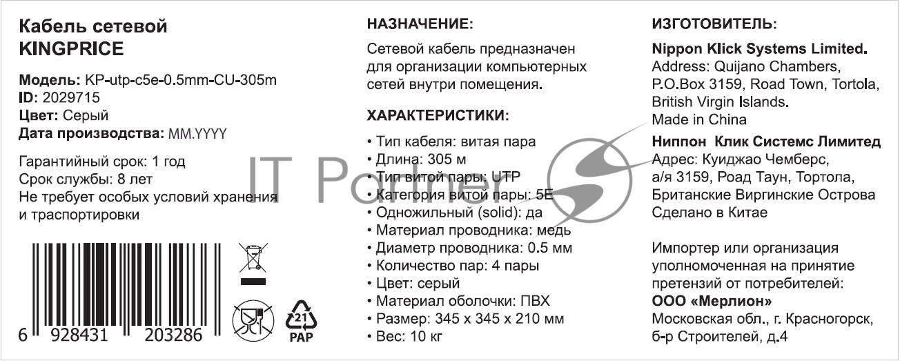 Кабель сетевой KingPrice KP-utp-c5e-0.5mm-CU-305m UTP 4 пары cat.5E solid 0.50мм Cu 305м серый
