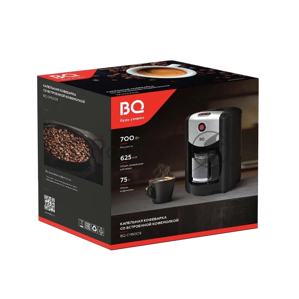Кофеварка капельная со встроенной кофемолкой BQ CM1009 черный-стальной, исп. кофе — зерновой/молотый, 0.625 л, 700 Вт.