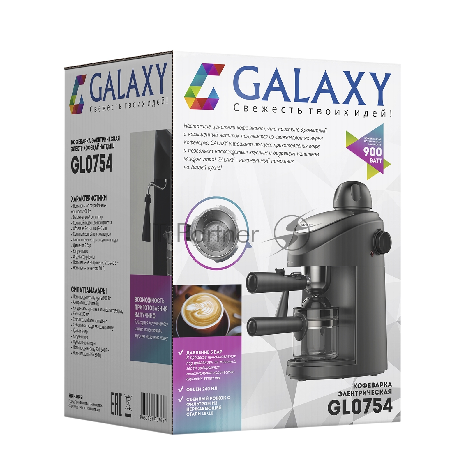 Кофеварка рожковая Galaxy Line GL 0754 черный, исп. кофе — молотый, 0.24 л, 900 Вт, 5 Бар.