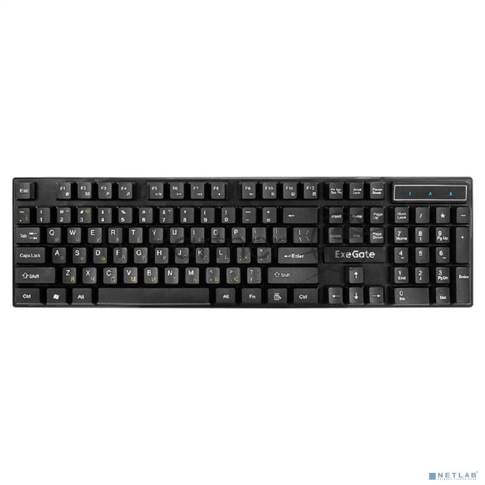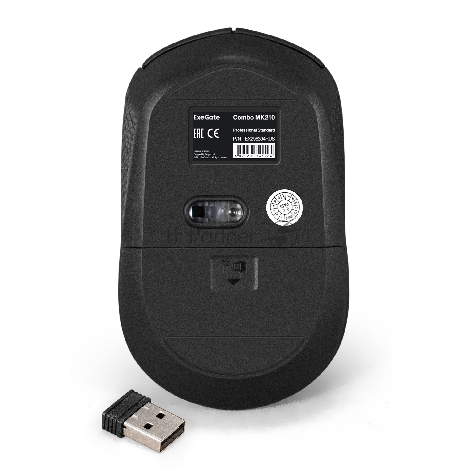 Комплект беспроводной ExeGate Professional Standard Combo MK210 (клавиатура полноразмерная влагозащищенная 104кл. + мышь оптическая 1200dpi, 3 кнопки и колесо прокрутки; USB, радиоканал 2,4 ГГц, радиус действия до 10м, черный, Color Box)