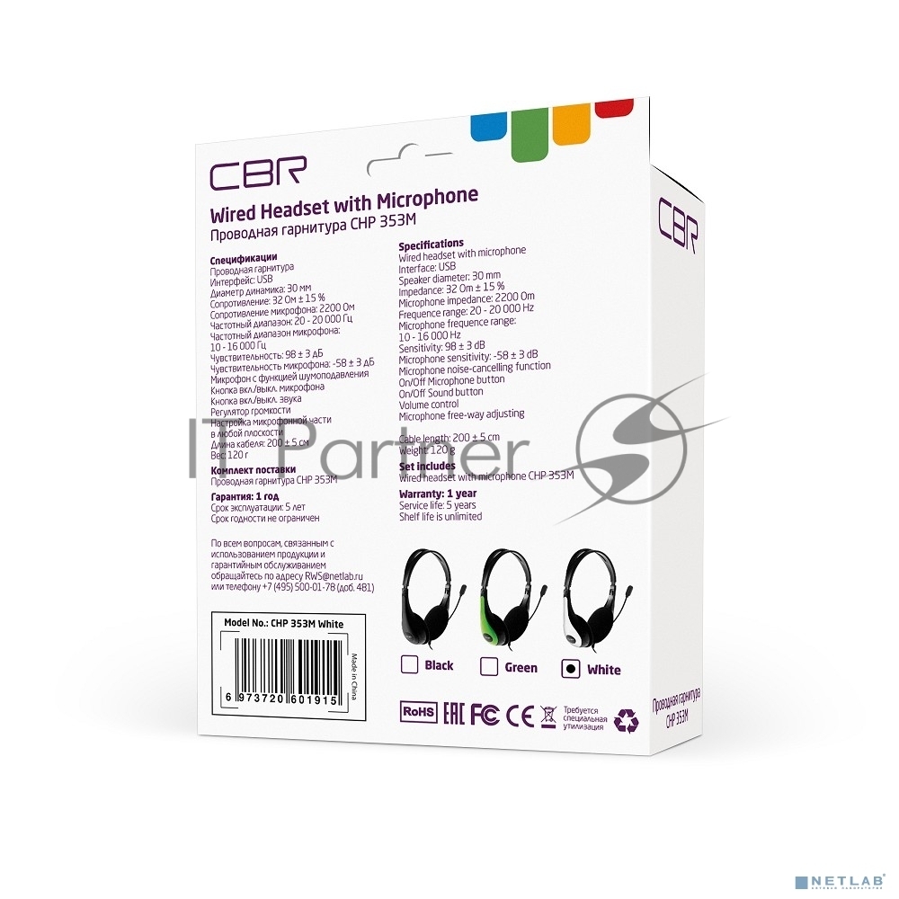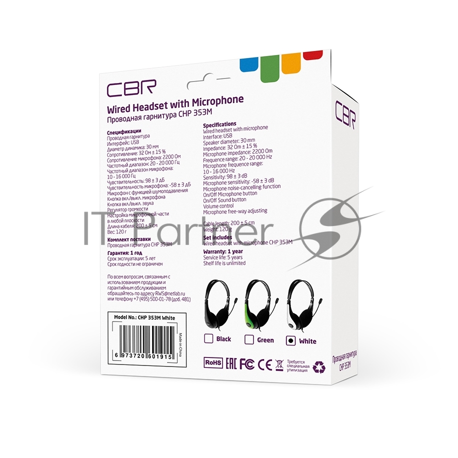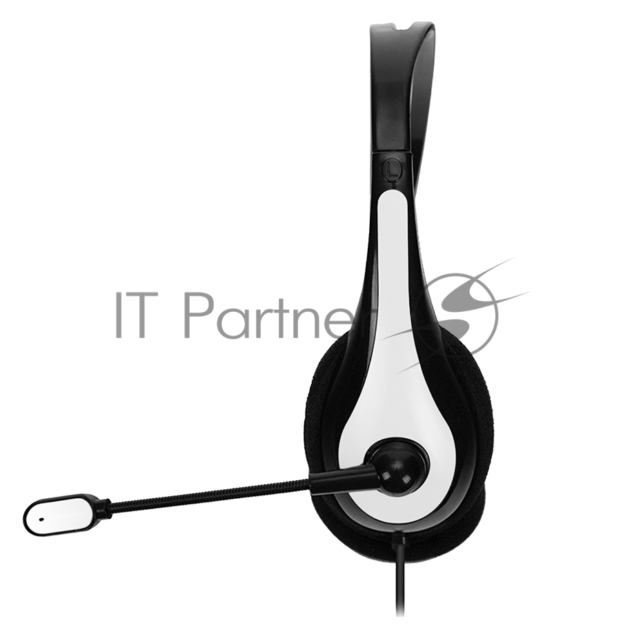 Компьютерная гарнитура CBR CHP 353M White проводная стерео, микрофон с шумоподавл., накл. наушники, USB, кнопка выкл. микрофона, регул. громк., регул. оголовья, длина каб. 2 м, цвет чёрный-белый