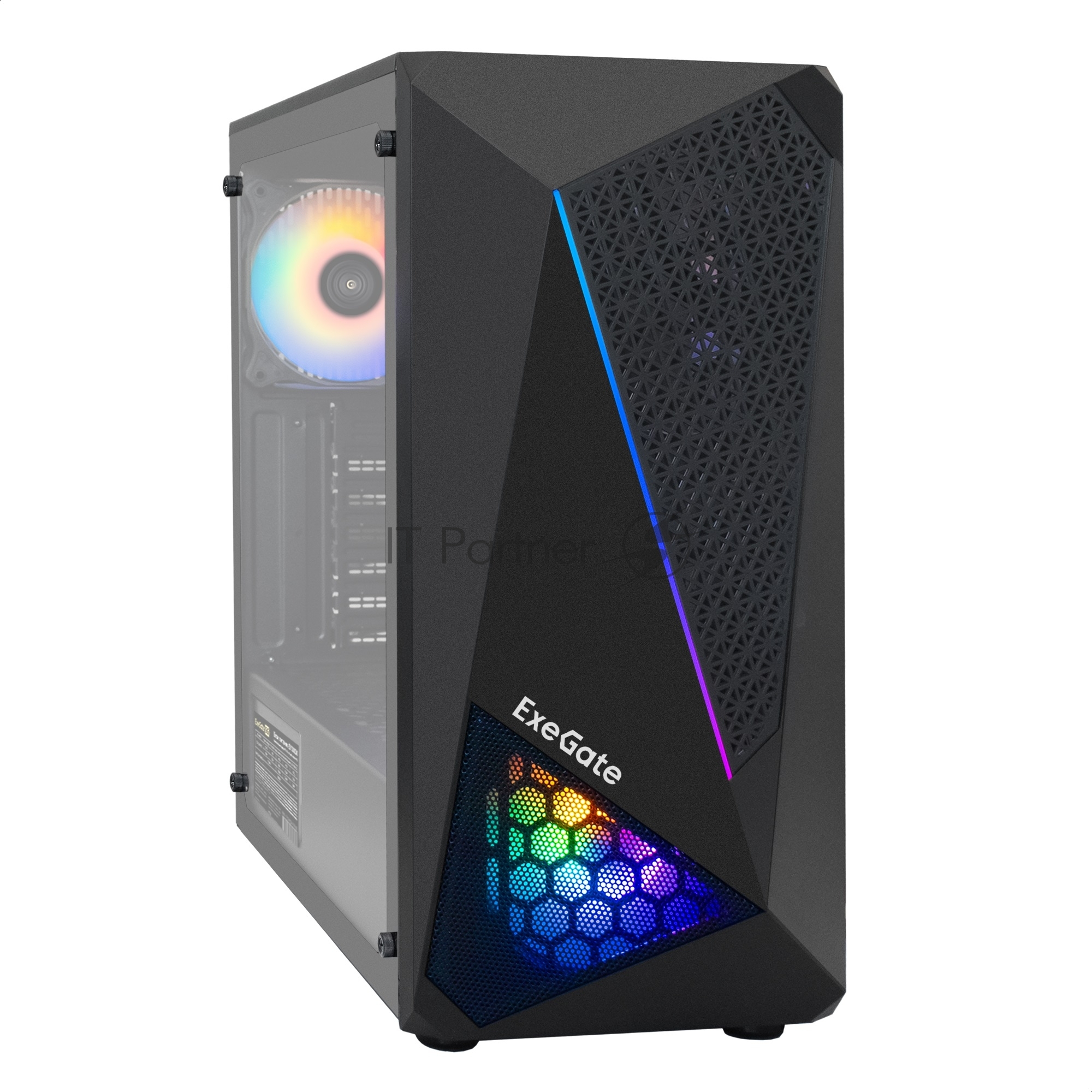 Компьютерный корпус Miditower ExeGate EVO-8225-EVO800 (ATX, БП EVO800RGB с вент. 12см, 2*USB+1*USB3.0, черный, 2 вент. с RGB подсветкой и полоса на передней панели, боковая панель — закаленное стекло)