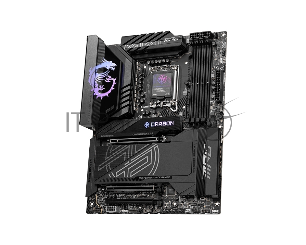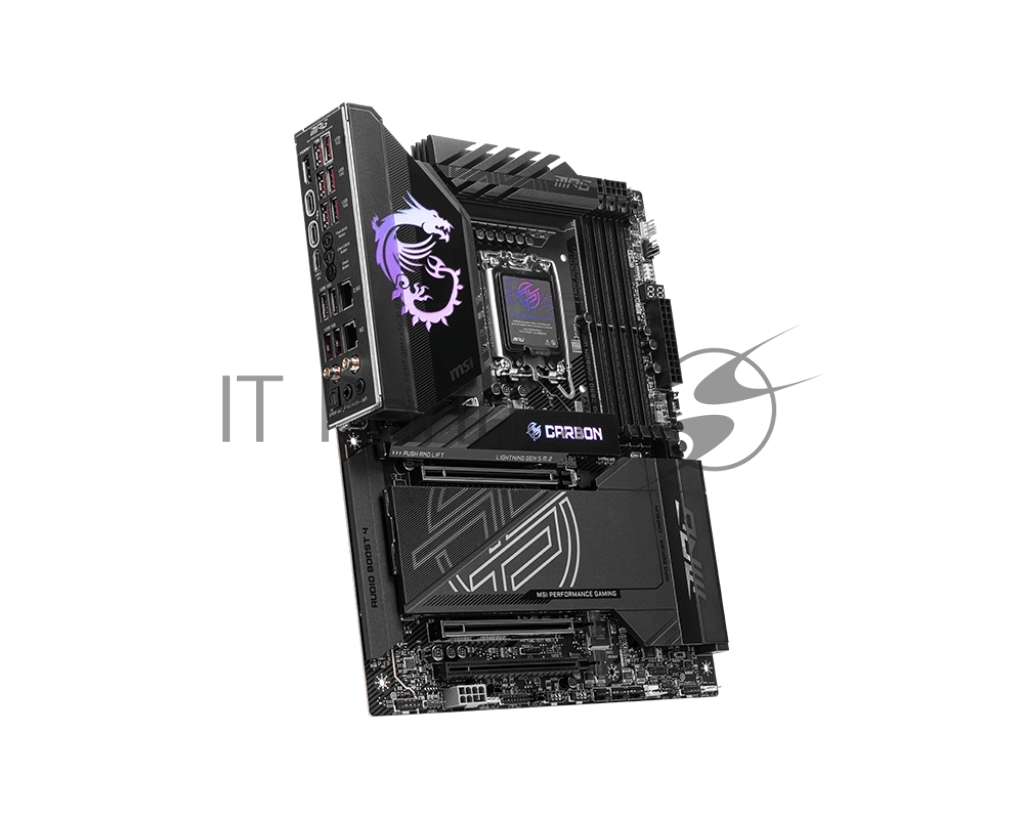 Материнская плата MSI MPG Z890 CARBON WIFI, LGA 1851, Intel Z890, 4xDDR5, 4xSATA, 5xM.2, 1xPCI-E 5.0 x16, 1xPCI-E 5.0 x8, 1xPCI-E 4.0 x4, 1xHDMI, 2xUSB-C Thunderbolt 4, 1xUSB-C 3.2 Gen 2, 10xUSB-A 3.2 Gen 2, 2x 5Gb LAN, 2×3.5 мм, 7.1, ATX