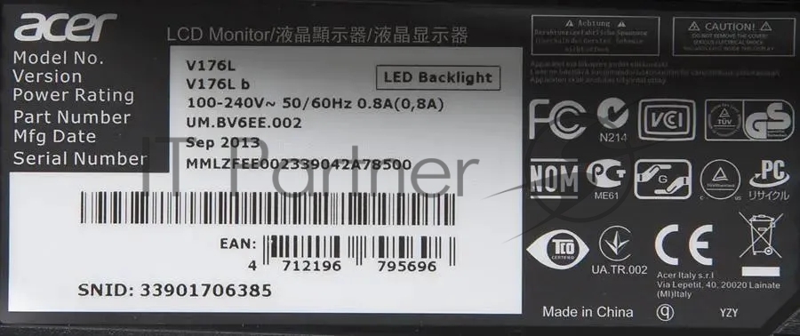Монитор 17″ Acer V176Lb TN+film 1280×1024, 75 Гц, 5 мс, 5:4, 250 кд/м2, 1xVGA, черный