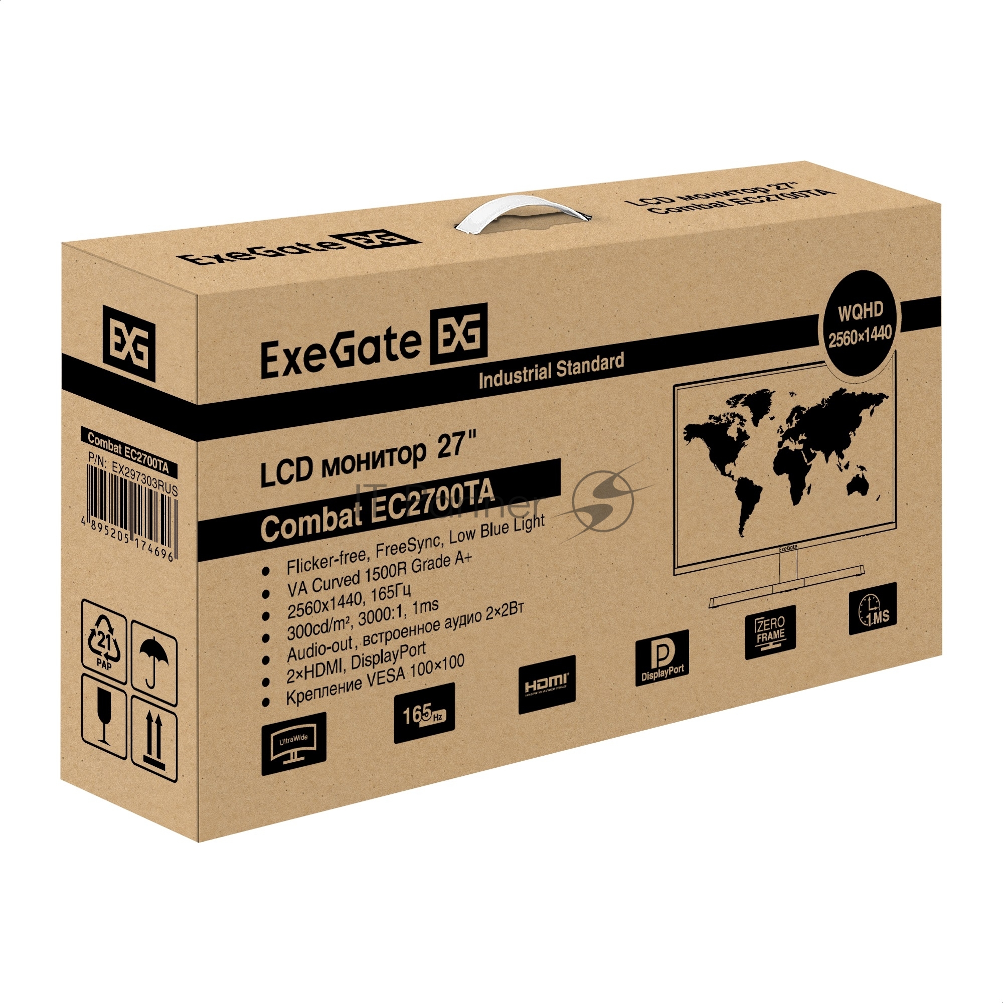 Монитор 27″ ExeGate Combat EC2700TA VA 2560×1440, 165 Гц, 1 мс, 16:9, 300 кд/м², 1xHDMI, 1xDP, 2xUSB, 3.5 мм, изогнутый R1500, черный