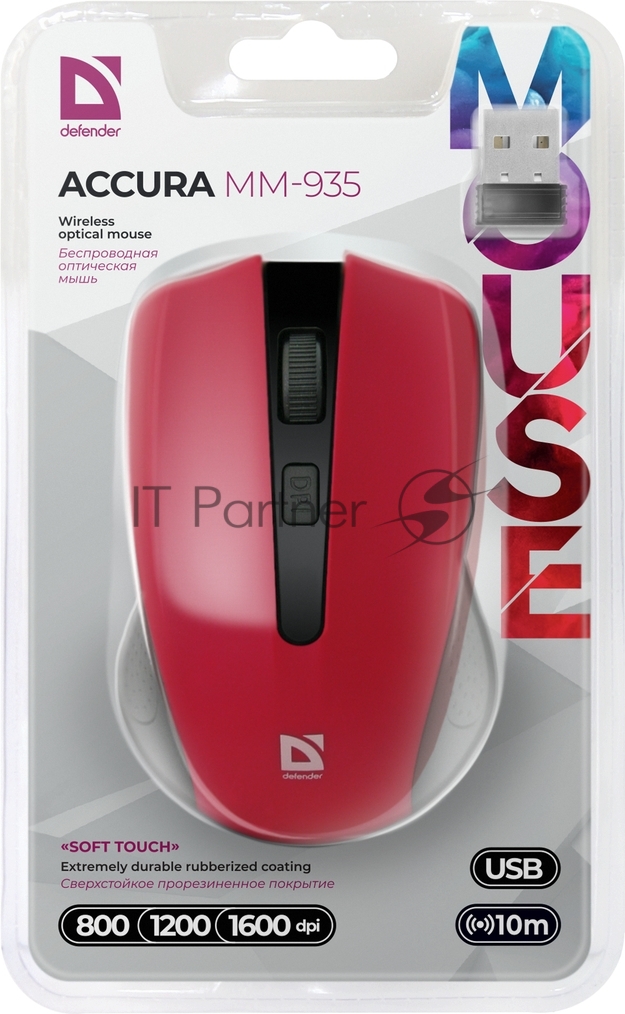 Мышь беспроводная Defender Accura MM-935 красный, 1600 dpi, радиоканал, USB, кнопки — 4