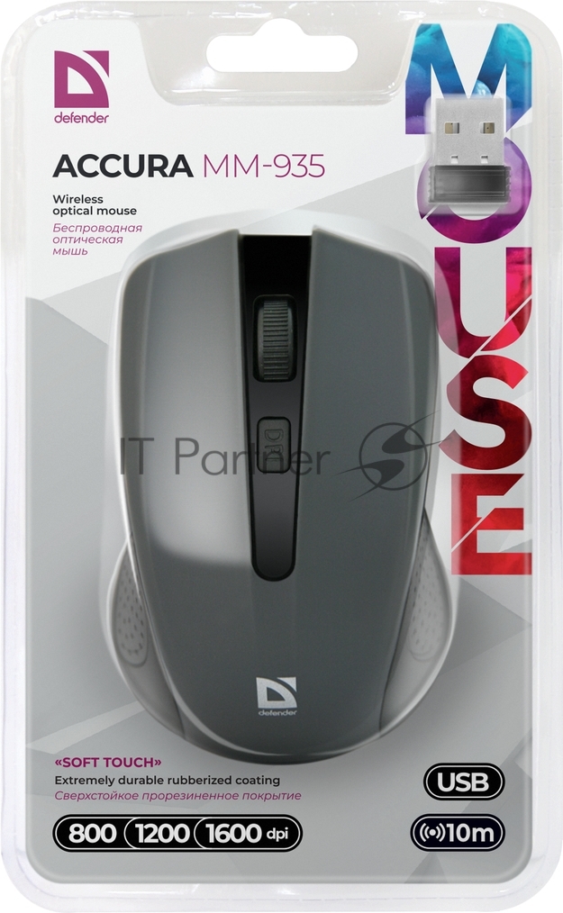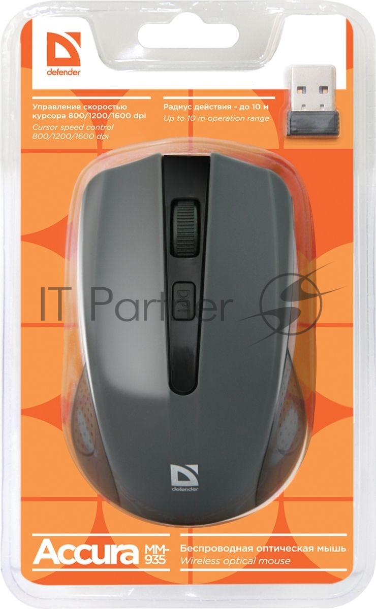 Мышь беспроводная Defender Accura MM-935 серый, 1600 dpi, радиоканал, USB, кнопки — 4