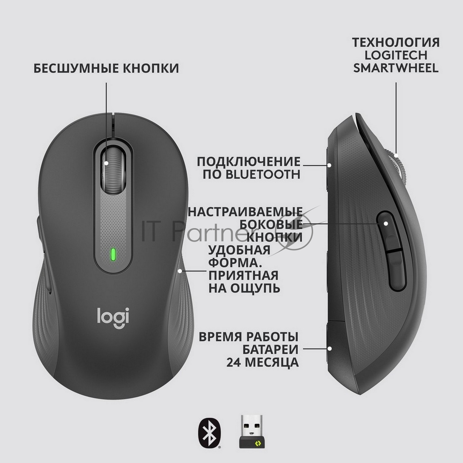 Мышь беспроводная Logitech Signature M650 графитовый, 4000 dpi, радиоканал, Bluetooth, USB, кнопки — 5