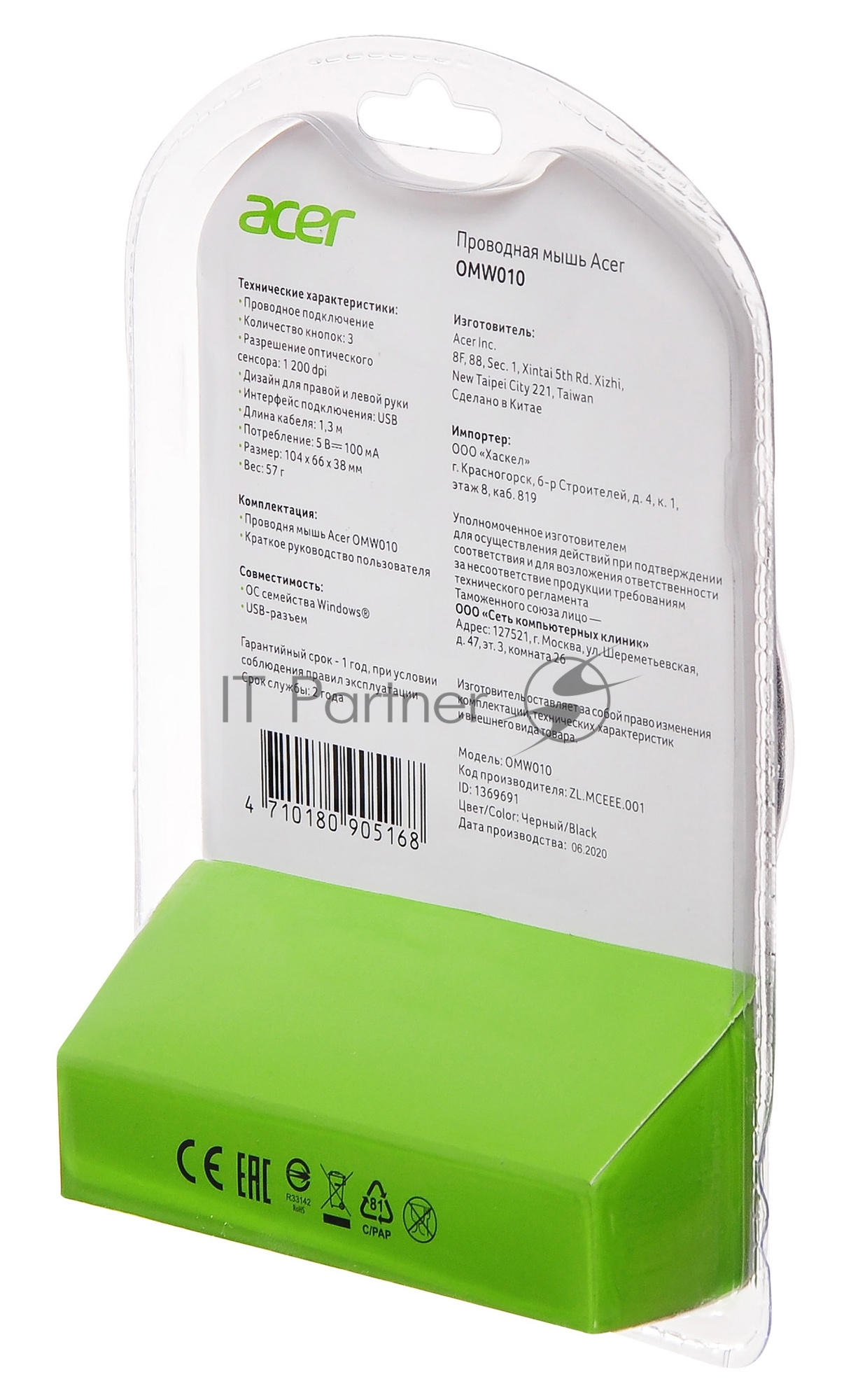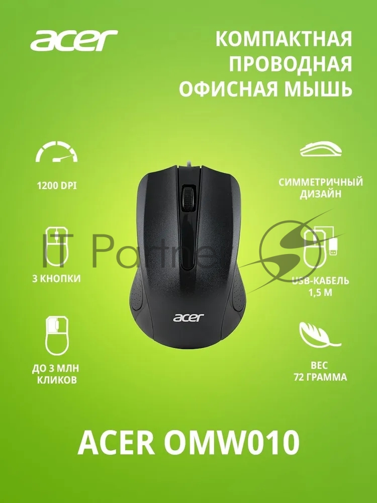 Мышь проводная Acer OMW010 черный, 1200 dpi, USB, кнопки — 3