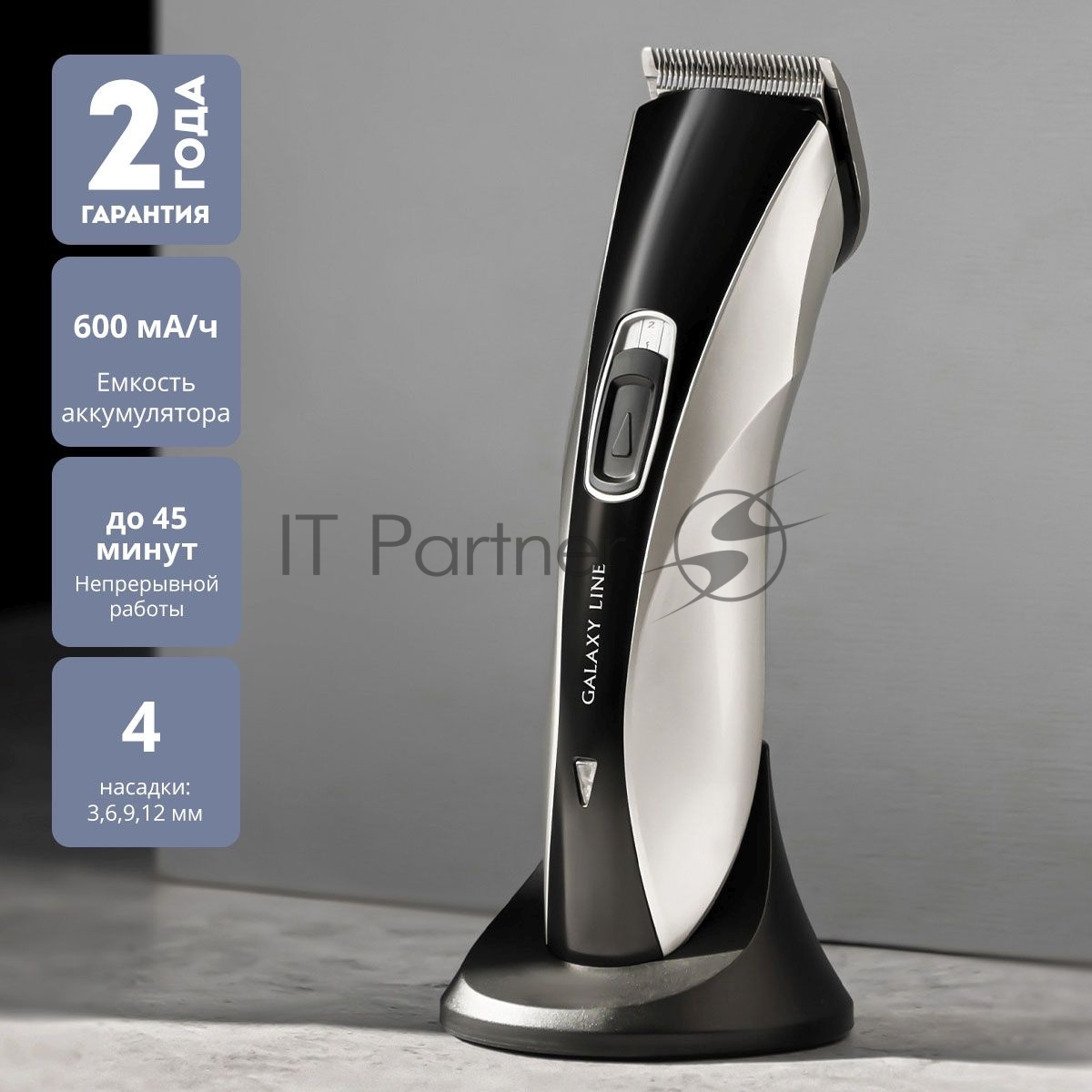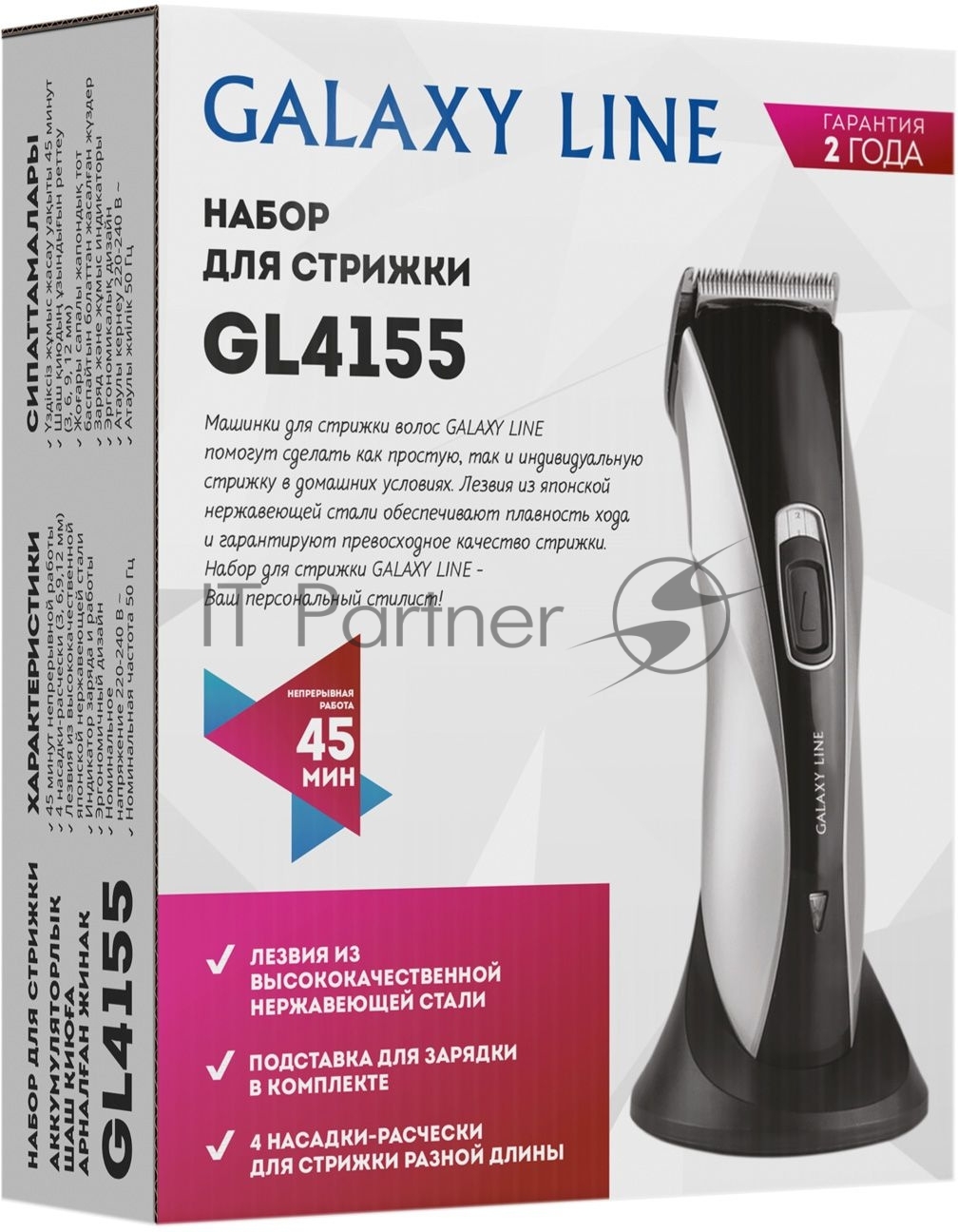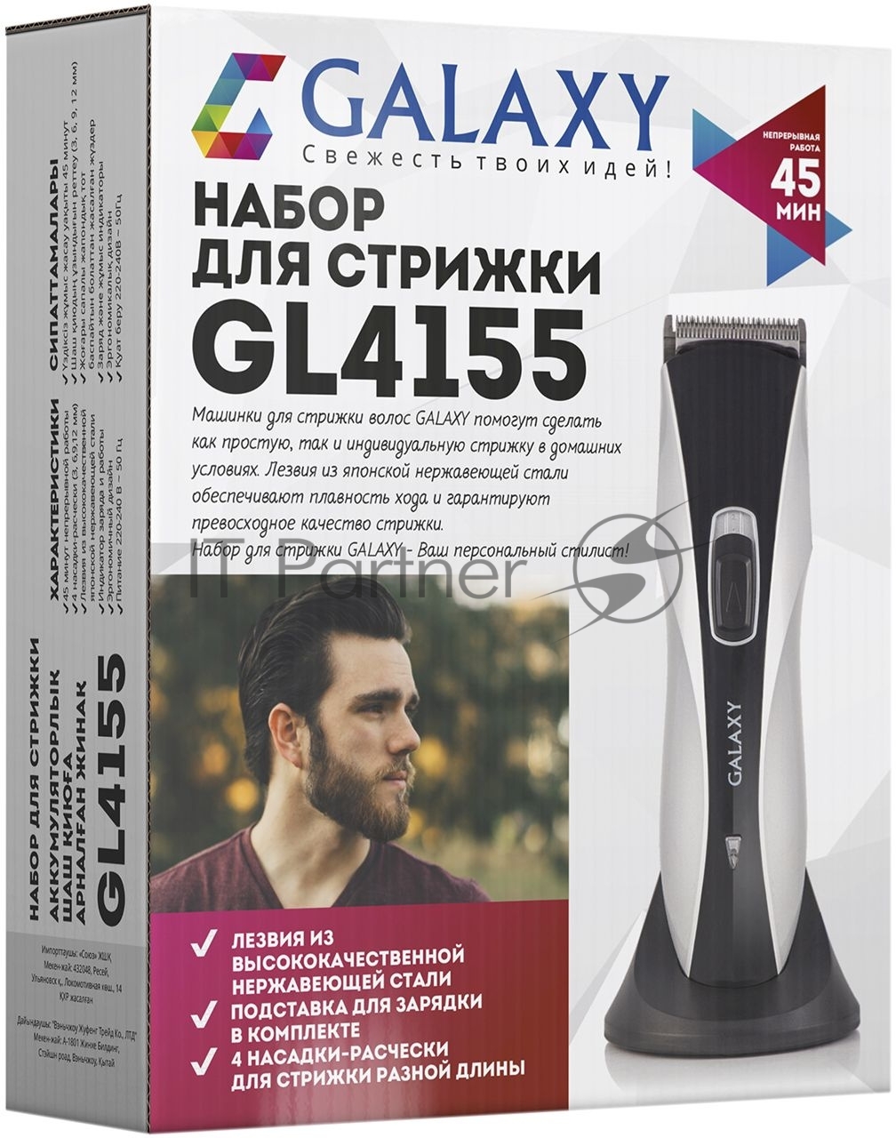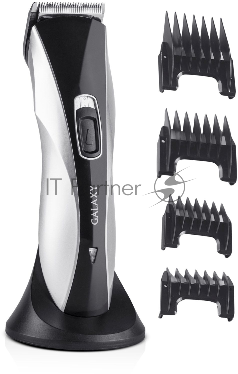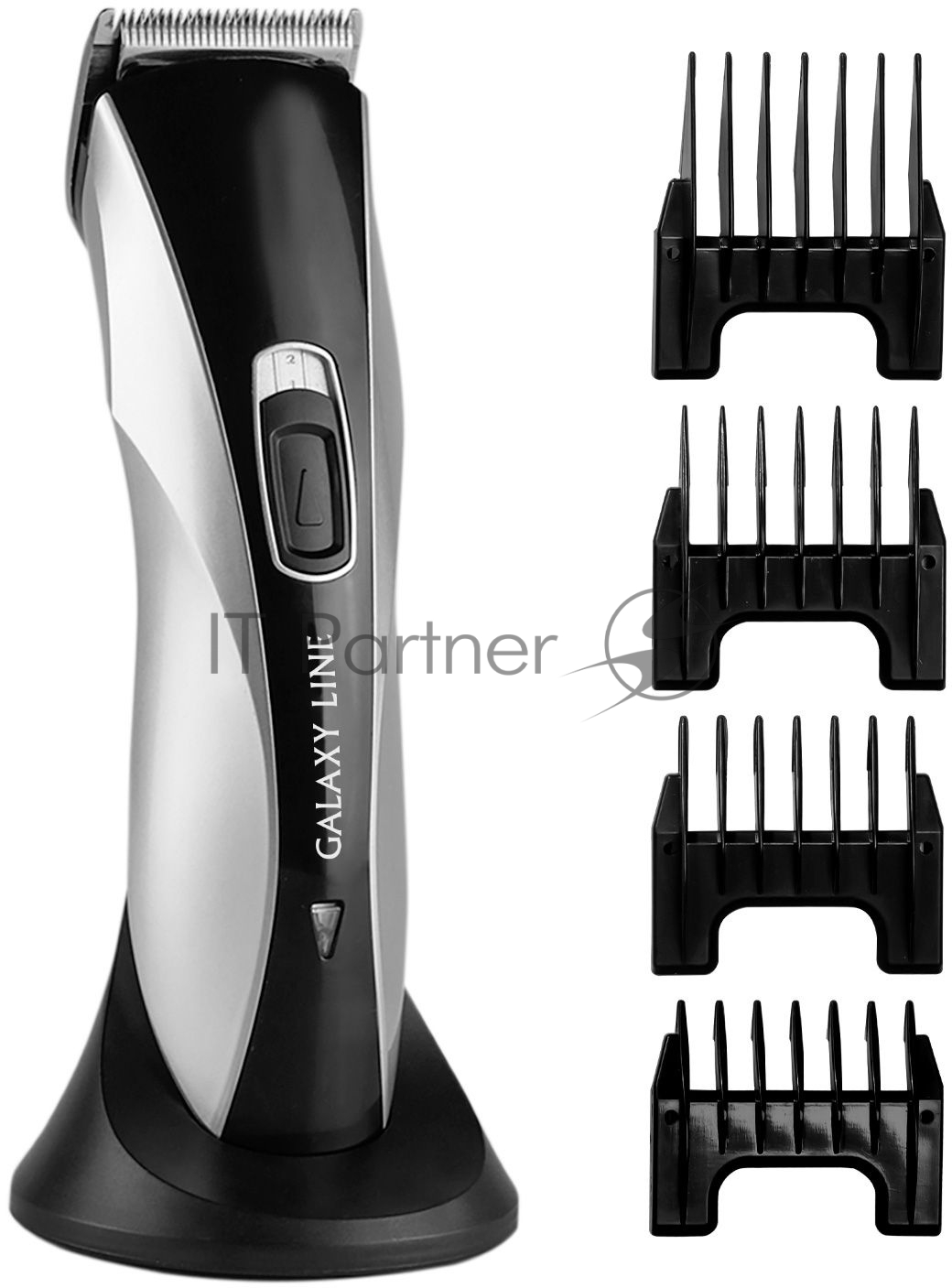 Набор для стрижки Galaxy Line GL 4155, черный с серебристым, лезвия из японской нержавеющей стали, индикатор работы и заряда, время непрерывной работы 45 мин, 4 насадки–расчески (3, 6, 9, 12 мм), эргономичный дизайн
