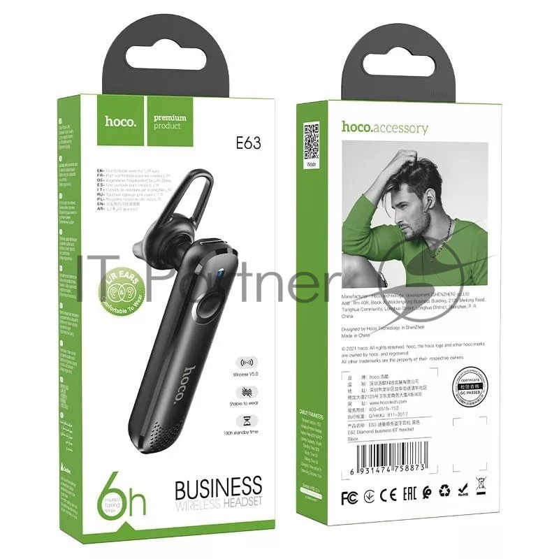 Наушники с микрофоном Hoco E63 черный внутриканальные BT крепление за ухом