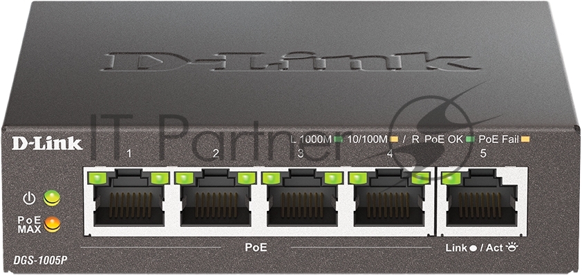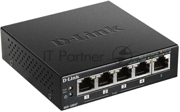 Неуправляемый коммутатор D-Link DGS-1005P/B3A с 5 портами 10/100/1000Base-T (4 порта PoE 802.3af/at, PoE-бюджет 60 Вт)