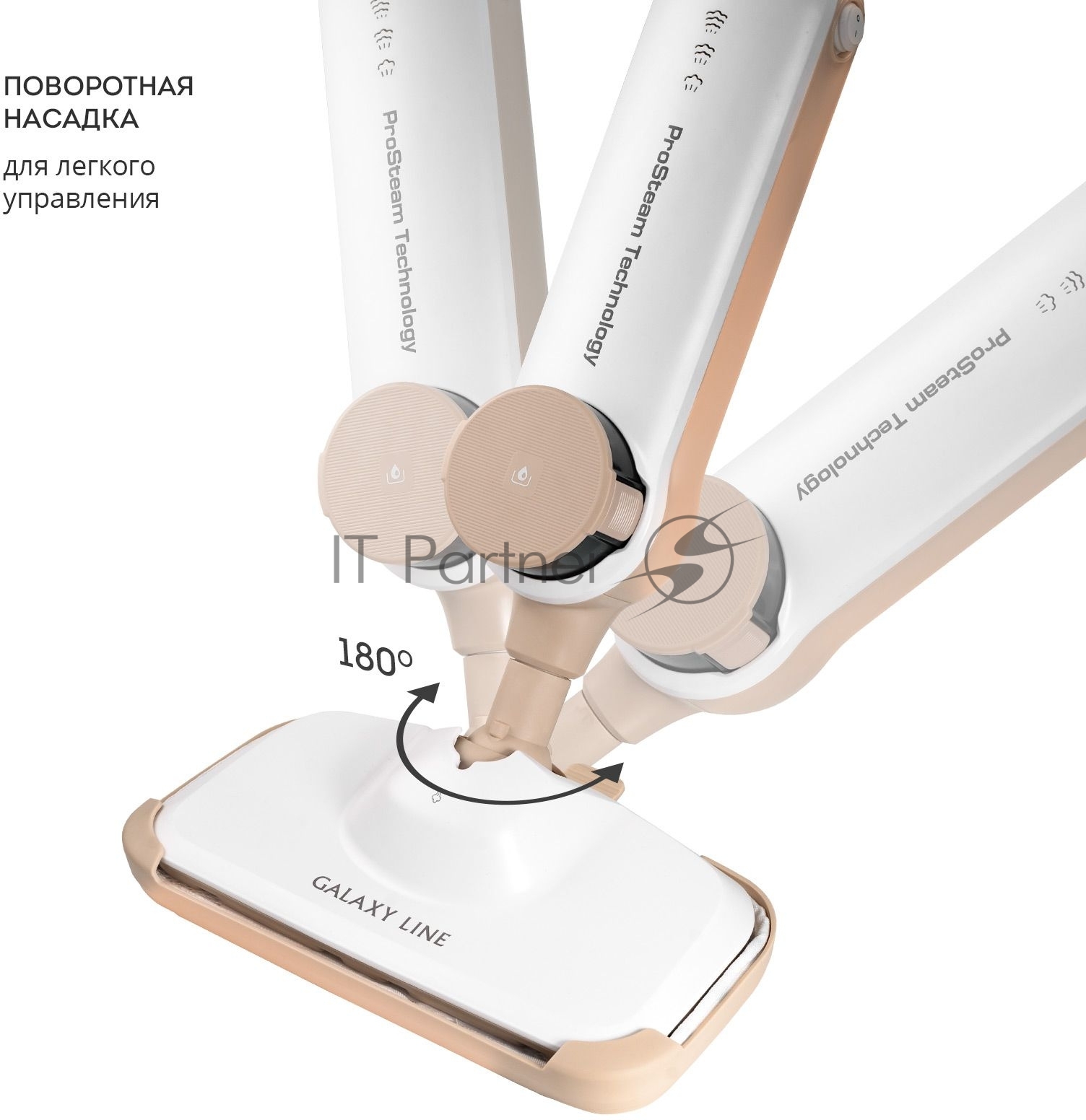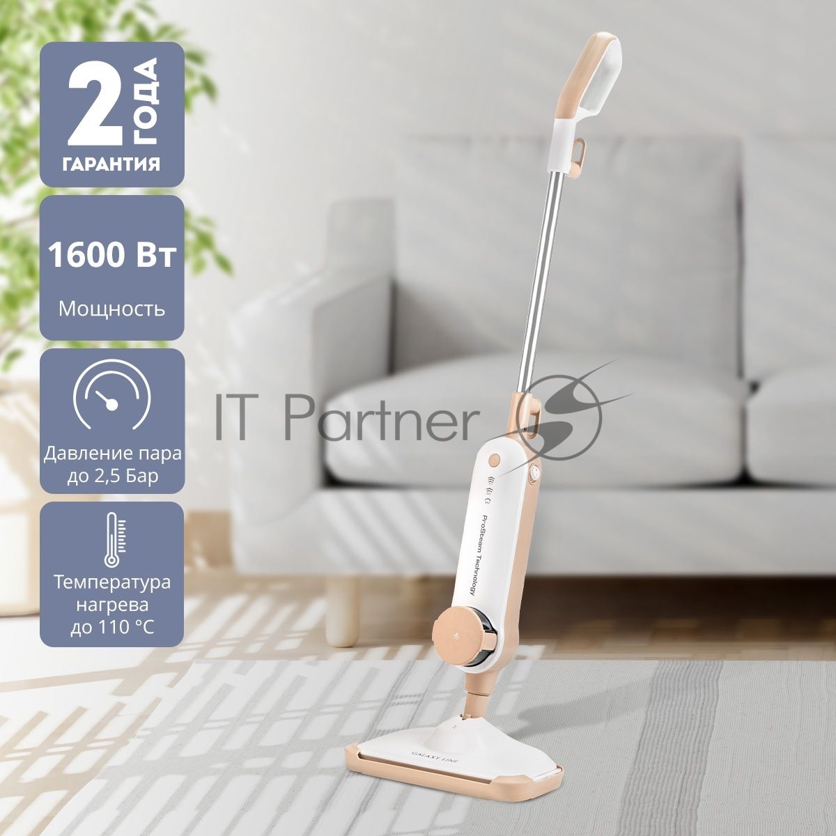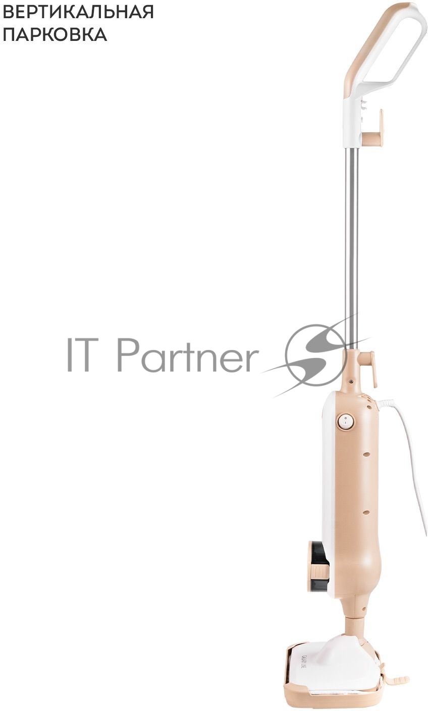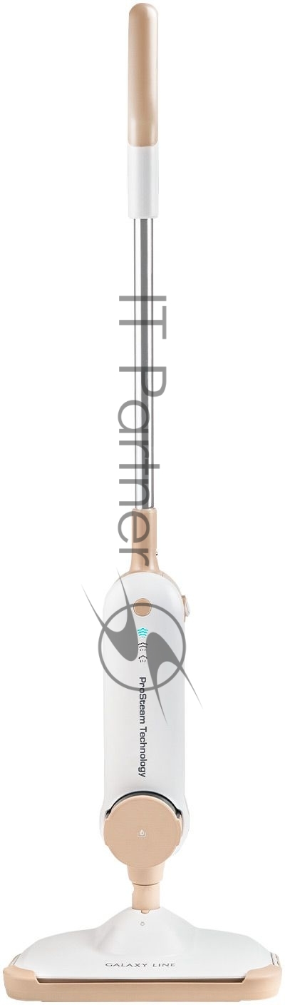 Паровая швабра Galaxy Line GL 6401, белый с бежевым, 1600 Вт, 0,35 л, 2,5 бар, 3 режима, время работы до 25 мин, макс. подача пара 35 г/мин, макс. температура нагрева 110°C, время нагрева 30 с, уборка на расстоянии до 6 м, вертикальная парковка, аксессуары: накладка из микрофибры, насадка для ковров, мерный стакан