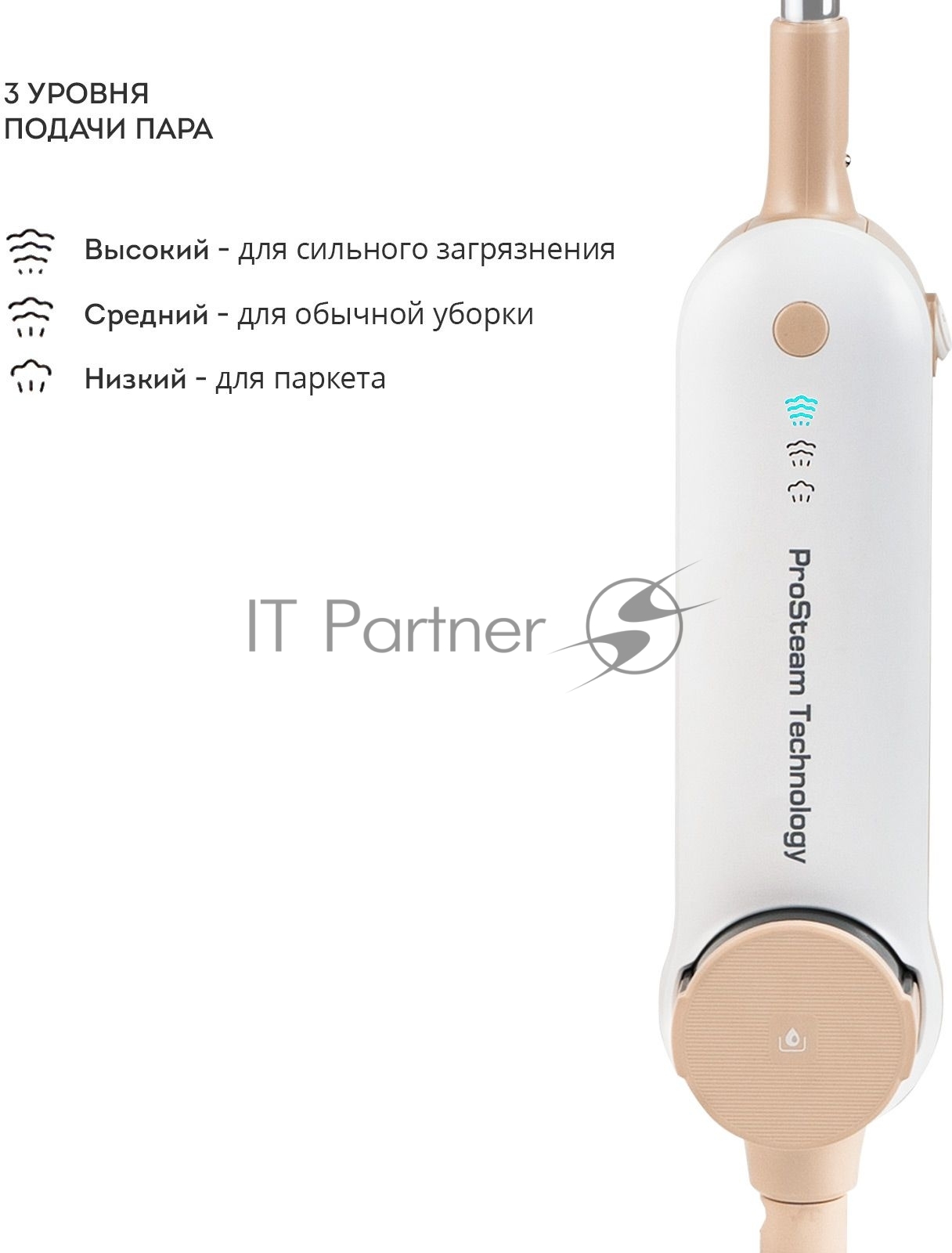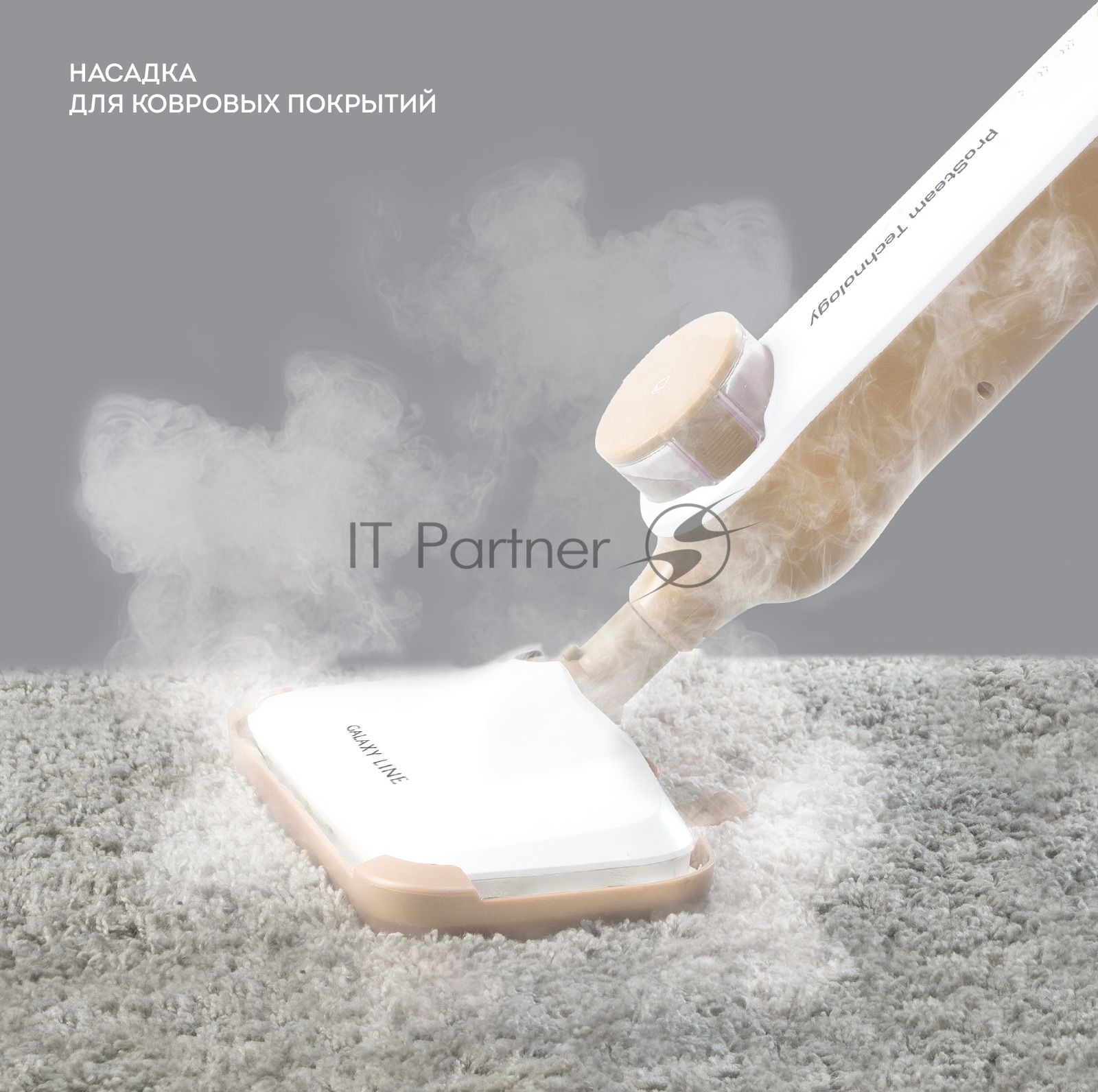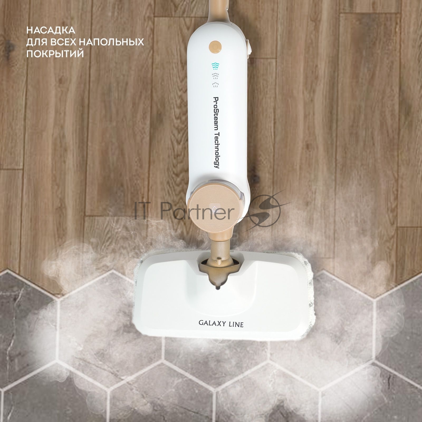 Паровая швабра Galaxy Line GL 6401, белый с бежевым, 1600 Вт, 0,35 л, 2,5 бар, 3 режима, время работы до 25 мин, макс. подача пара 35 г/мин, макс. температура нагрева 110°C, время нагрева 30 с, уборка на расстоянии до 6 м, вертикальная парковка, аксессуары: накладка из микрофибры, насадка для ковров, мерный стакан