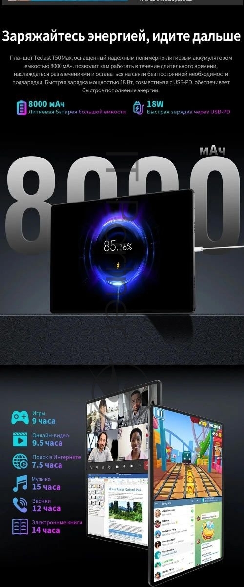 Планшет Teclast T50 Max G99 (2.2) 8C RAM8Gb ROM256Gb 11″ IPS 1920×1200 4G 1Sim Android 14 серебристый 13Mpix 8Mpix BT microSD 1Tb 8000mAh