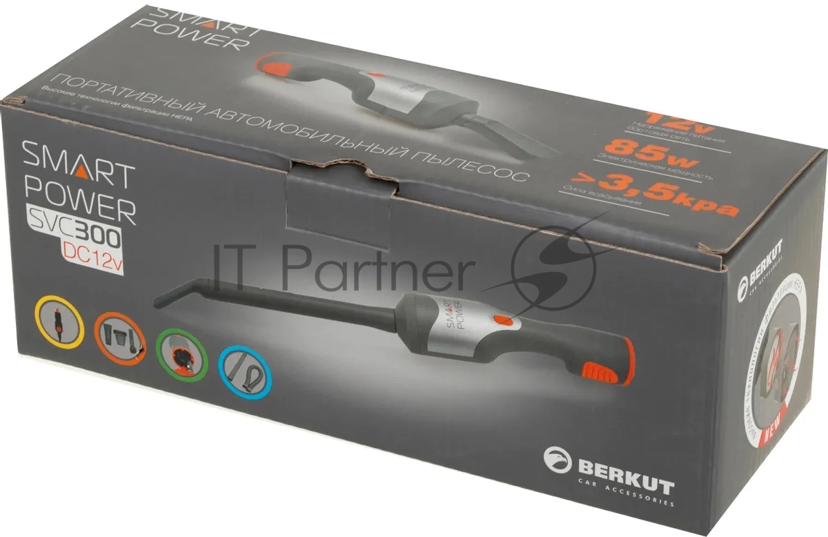 Пылесос автомобильный Berkut SVC-300 серый/оранжевый, 55/85 Вт, уборка сухая, пылесборник контейнер 0.35 л