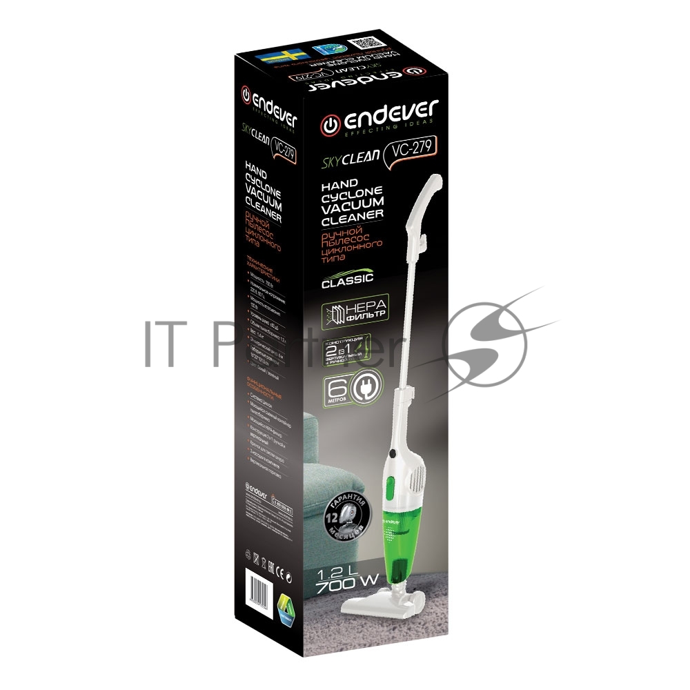 Пылесос вертикальный циклонного типа Endever SkyClean VC-279, белый/зеленый, мощность 700 Вт, циклонная система фильтрации, 6 шт/уп