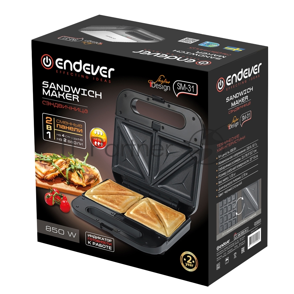 Сэндвичница электрическая Endever Skyline SM-31 «2 в 1» черный/стальной, 850 Вт, автом. терморегулятор, размеры 23,4*22,7 см