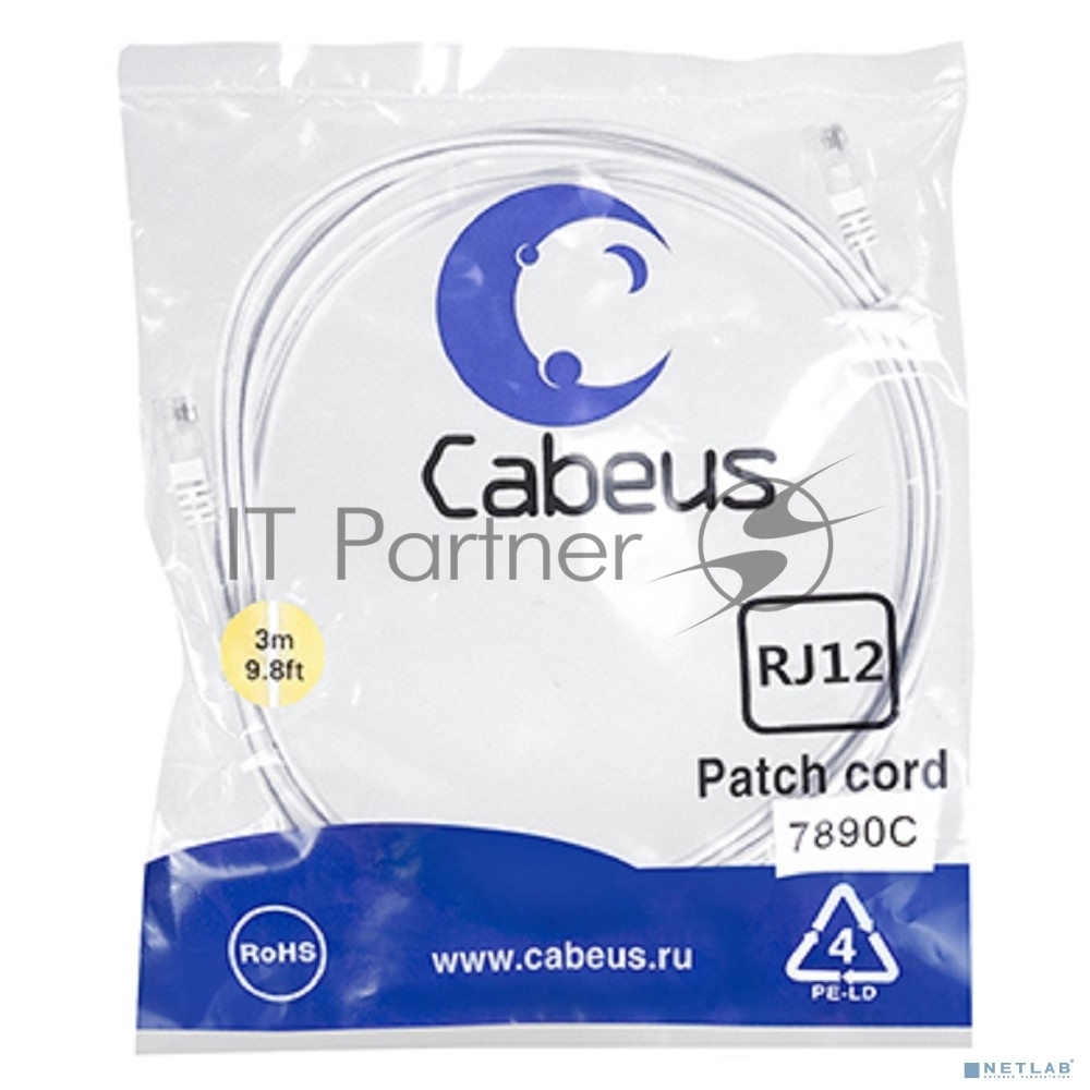 Шнур комм. Cabeus, кат. , неэкр., U/UTP, RJ12(6p4C), PVC, AWG28, 3м, белый