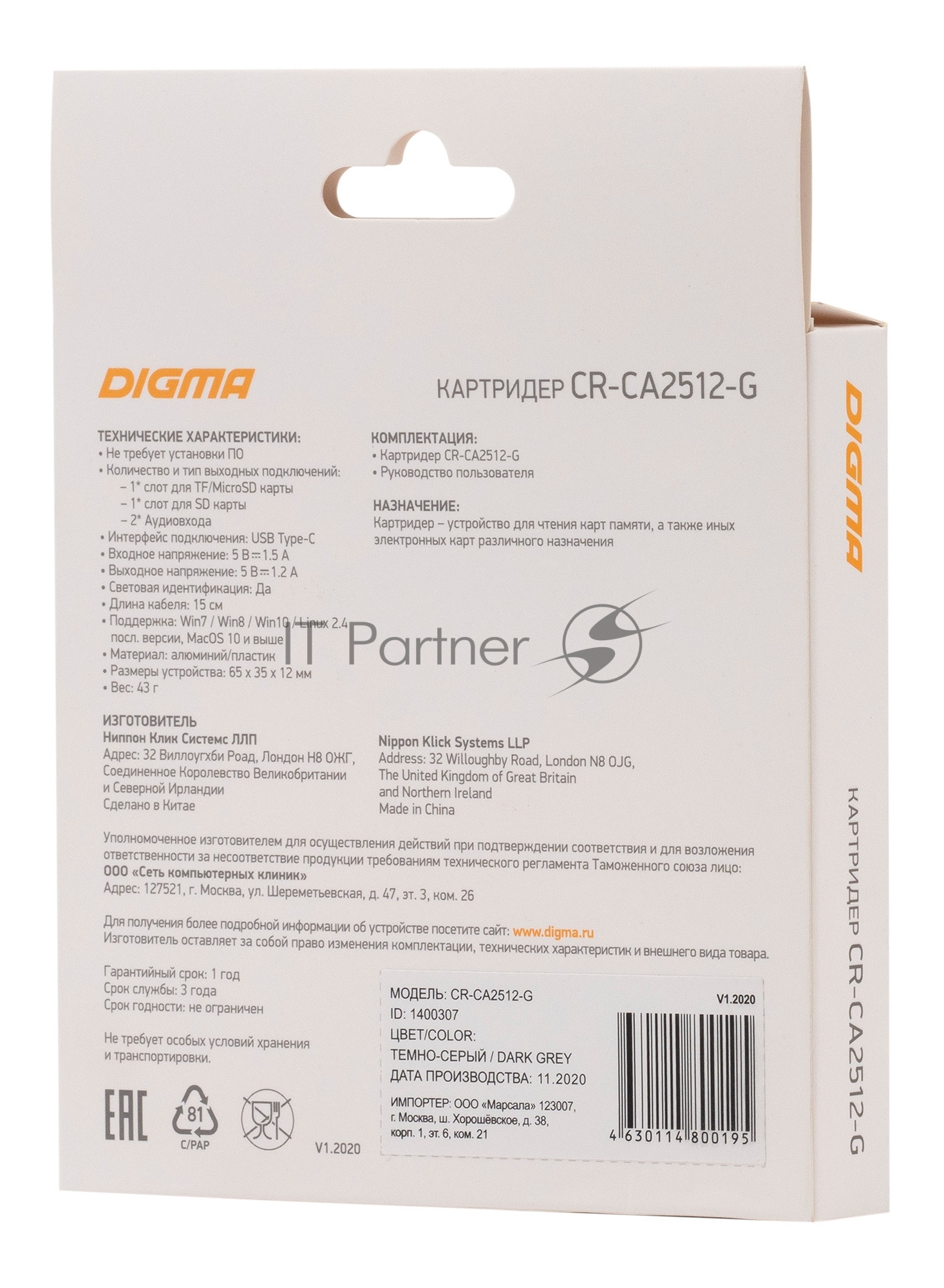 Устройство чтения карт памяти Type C Digma CR-СA2512-G темно-серый