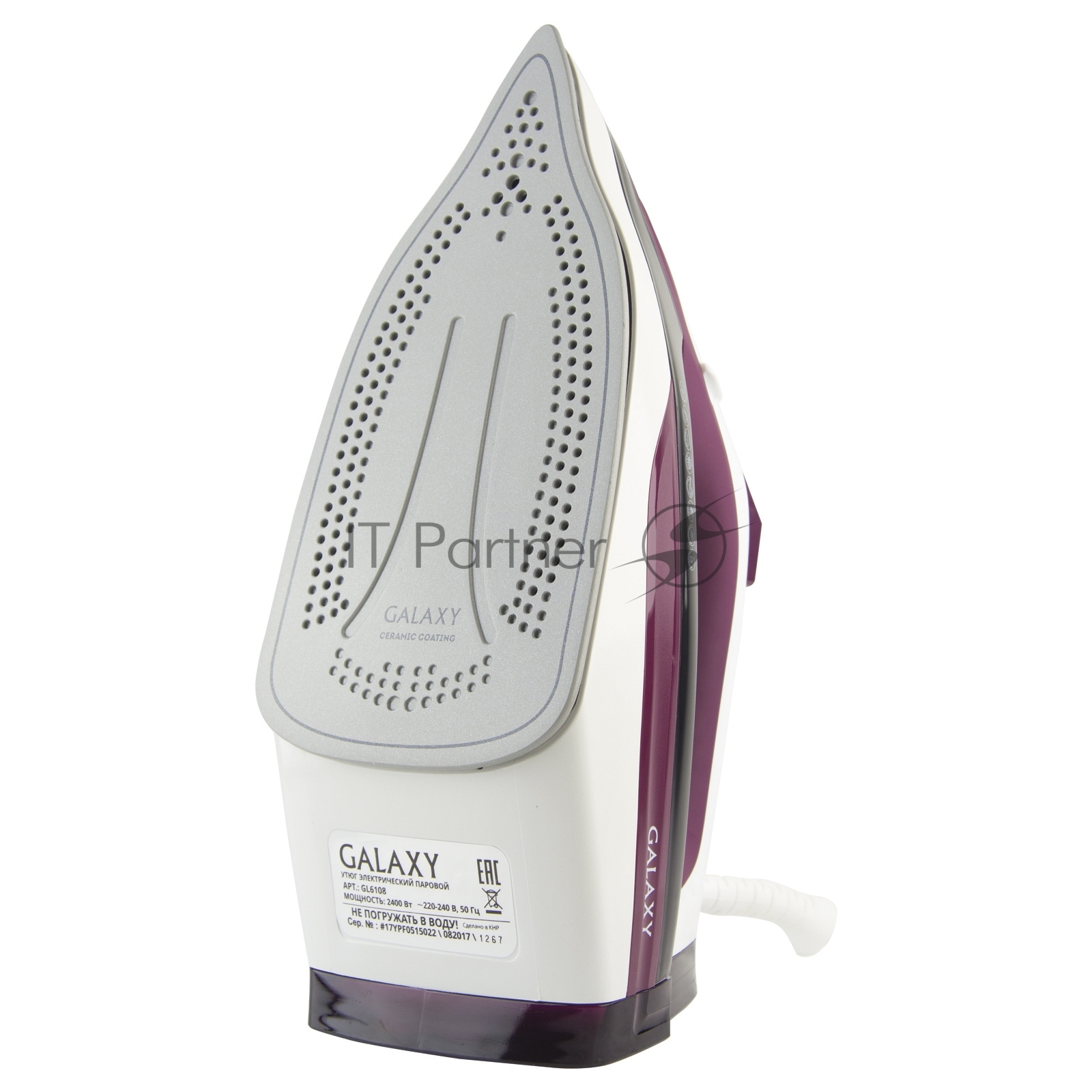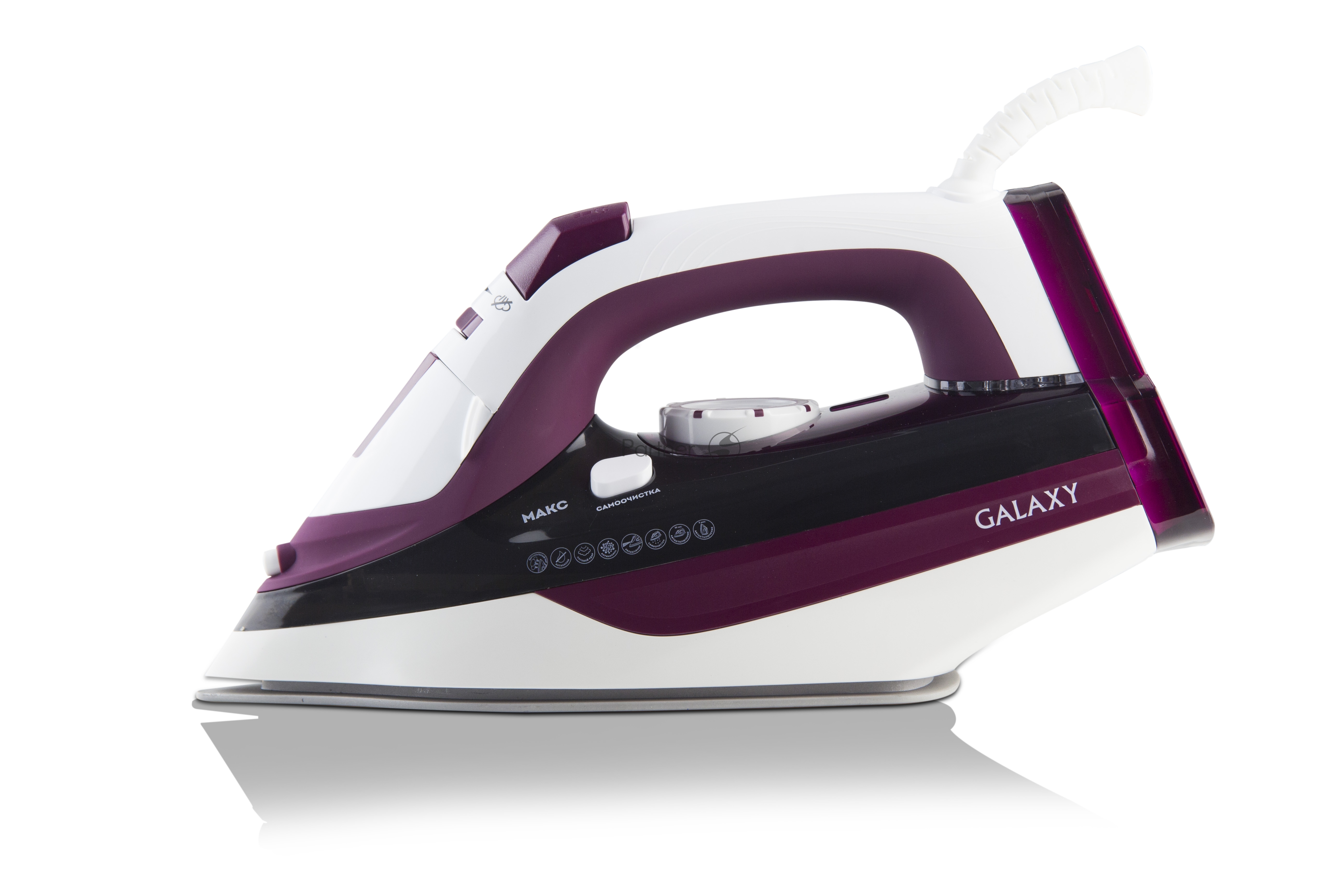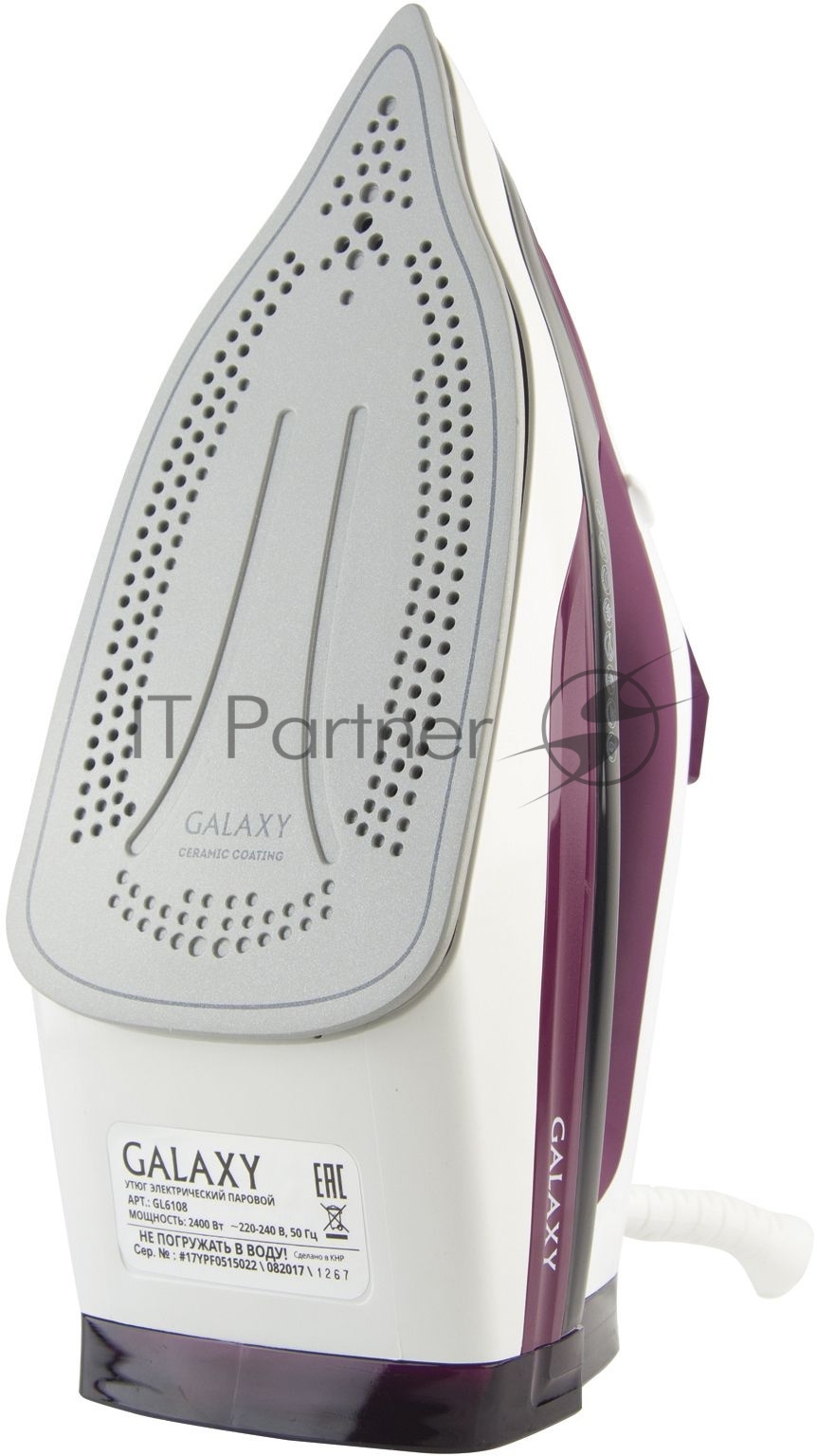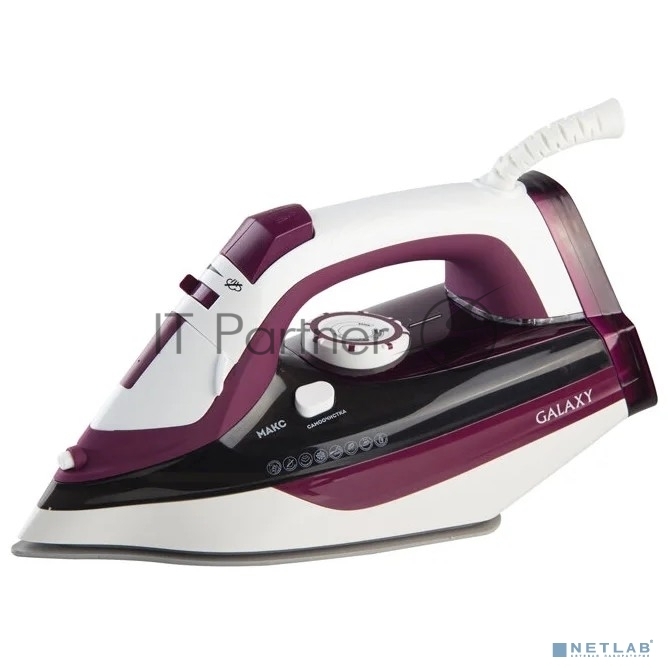 Утюг Galaxy Line GL 6108, бордовый с белым, паровой, 2400 Вт, постоянный пар 50 г/мин, паровой удар 230 г/мин, функции: автоотключение, самоочистка, антикапля, антинакипь, вертикальное отпаривание, индикатор автоотключения, индикатор нагрева, функция увлажнения, защита от перегрева, керамическое покрытие подошвы, резервуар для воды 500 мл