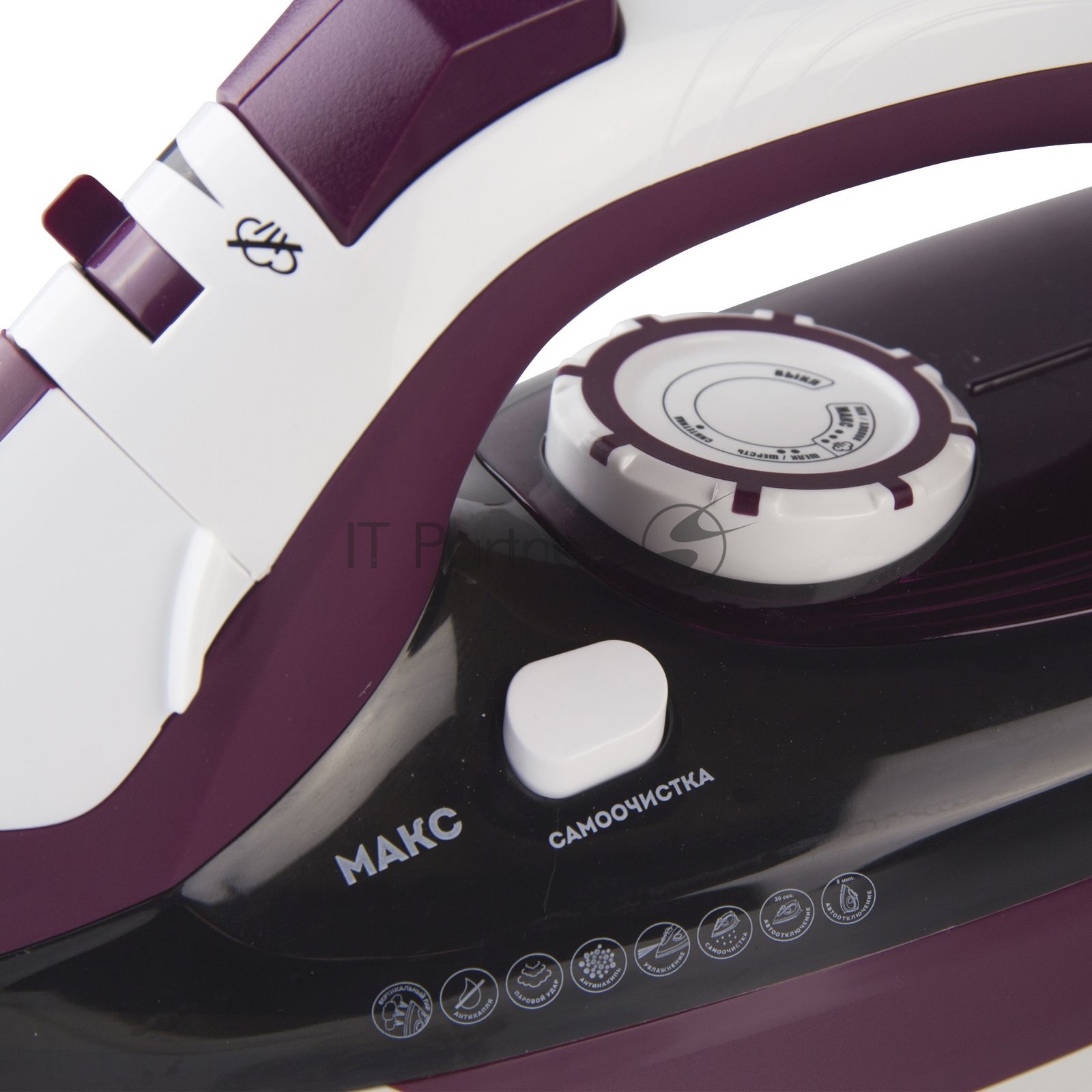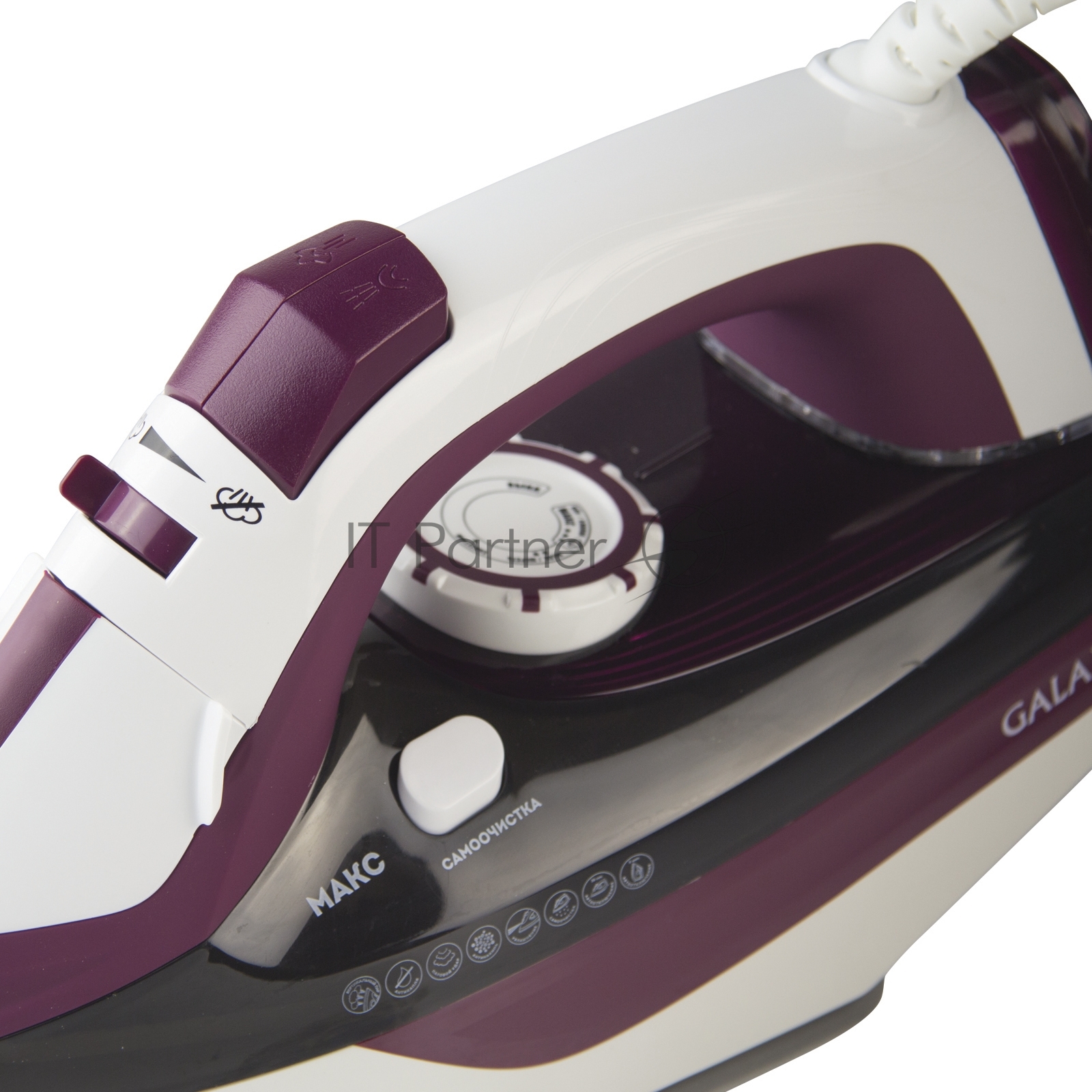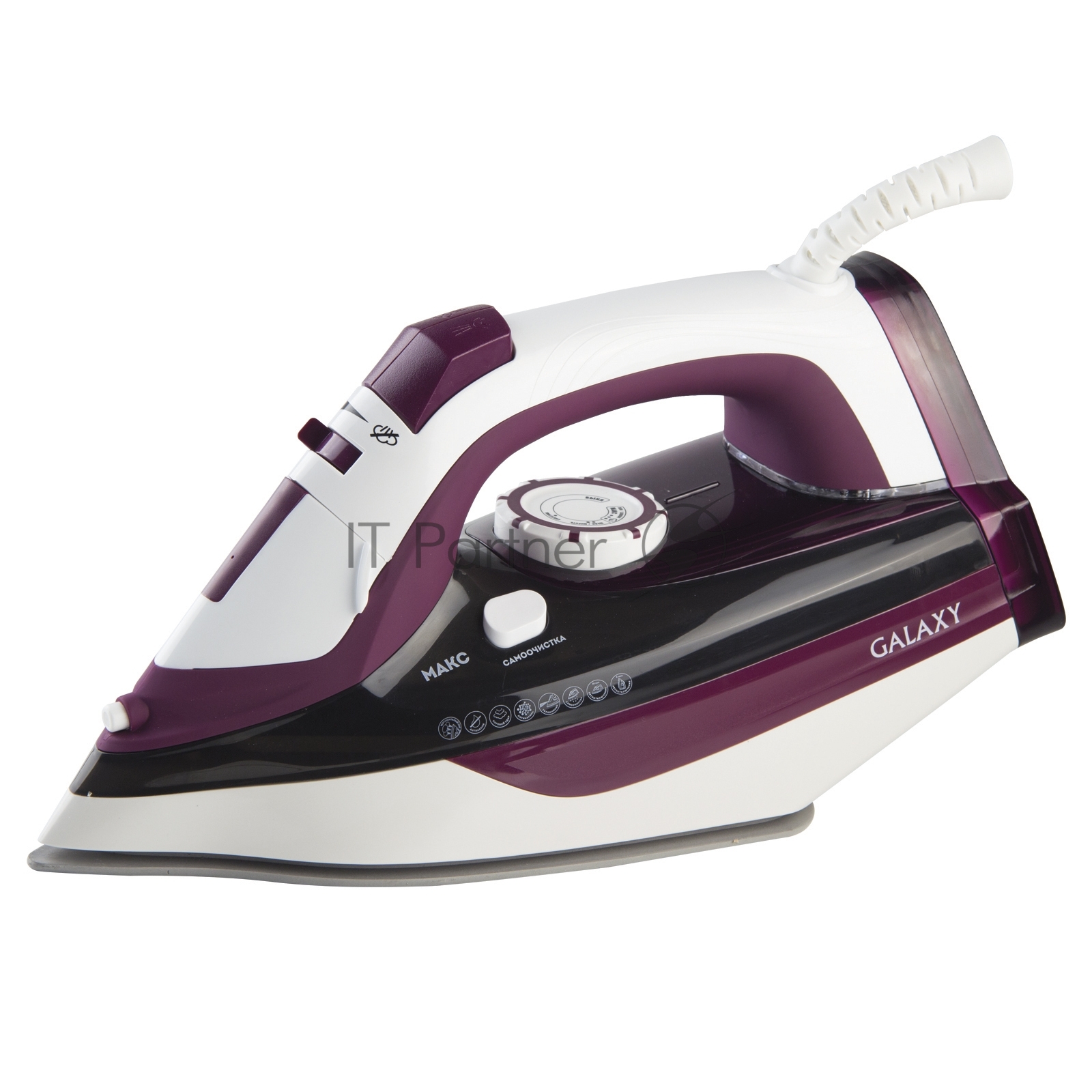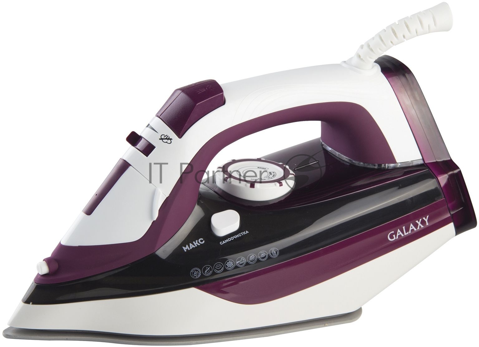 Утюг Galaxy Line GL 6108, бордовый с белым, паровой, 2400 Вт, постоянный пар 50 г/мин, паровой удар 230 г/мин, функции: автоотключение, самоочистка, антикапля, антинакипь, вертикальное отпаривание, индикатор автоотключения, индикатор нагрева, функция увлажнения, защита от перегрева, керамическое покрытие подошвы, резервуар для воды 500 мл