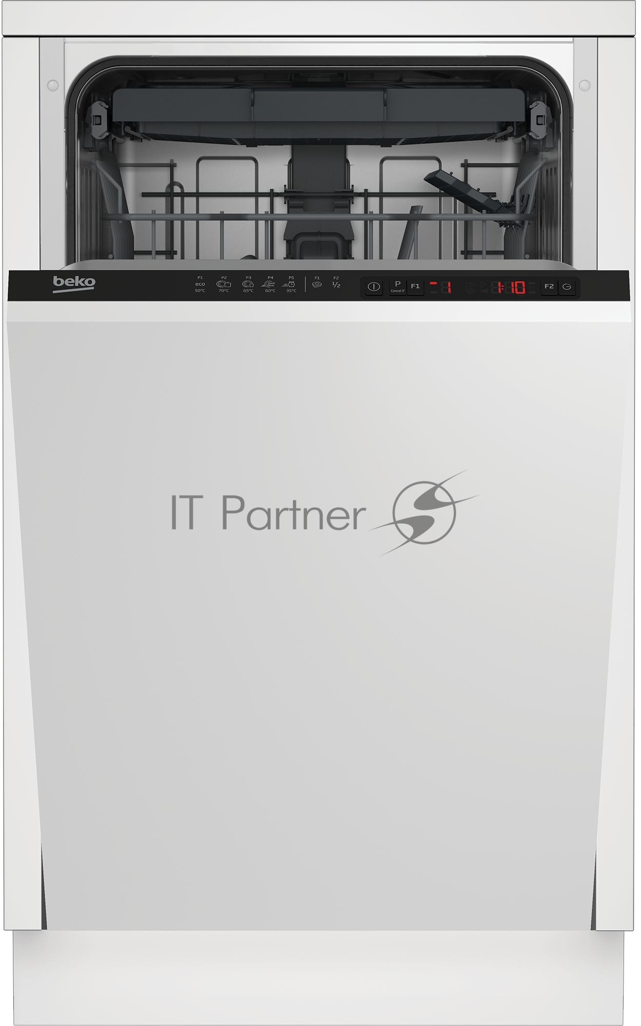 Встраиваемая посудомоечная машина Beko BDIS1W861, 45 СМ, 9 комплектов посуды, 5 программ мойки, 3 корзина, уровень шума 55 дБ, стандартный мотор, частичная защита от протечек Overflow Safety, функция Таблетка, половинная загрузка, кнопочное управление
